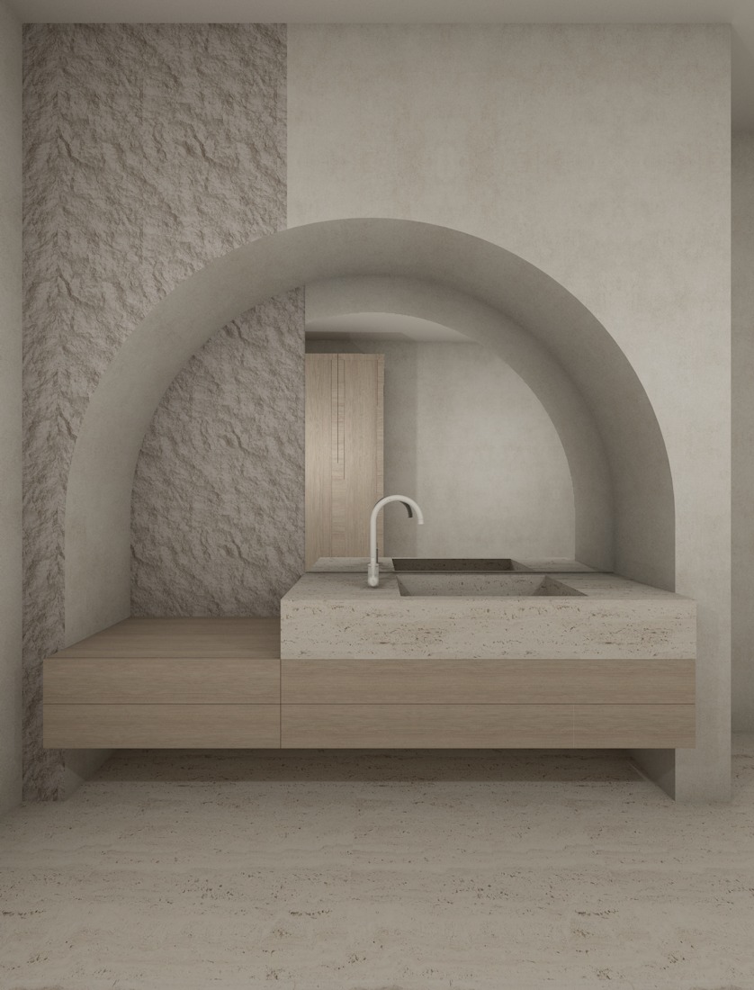create a highly realistic render of a minimal bathroom with a calm and serene atmosphere the space feels soft earthy and harmonious with a refined and natural aesthetic the main design feature is a large built in wall arch framing the vanity area the arch is smooth and sculptural finished in a light beige microcement creating a soft and monolithic look inside the arch the left section features a textured raw plaster surface adding contrast and depth while the rest remains smooth the vanity is built in and minimal with a thick beige travertine countertop and integrated sink below there are clean light wood drawers with a simple handle free design the faucet is minimal and modern in a soft neutral tone the floor and walls are finished in light beige microcement creating a seamless and continuous surface lighting is soft and diffused enhancing the textures without strong shadows ultra realistic render high resolution interior design magazine photography style