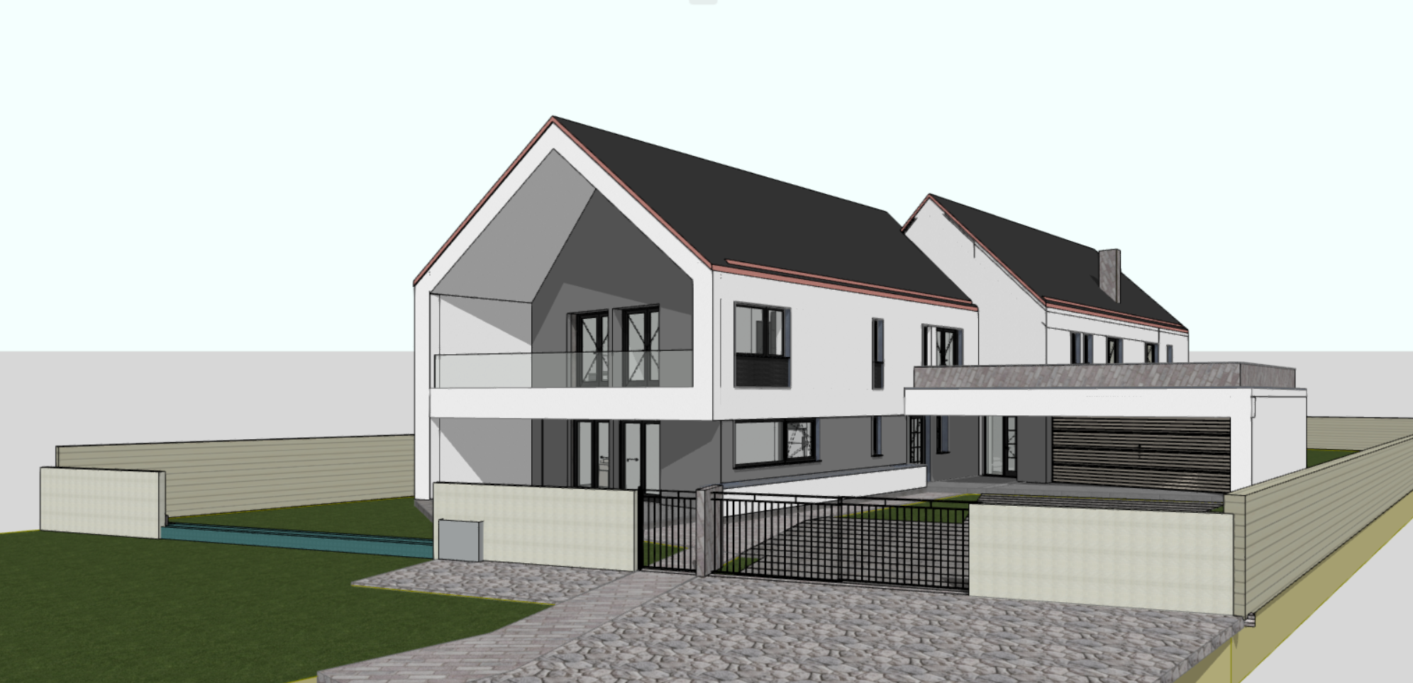 in winter lots of snow decorated with colored christmas lights outlining the roof vegetation background and trees