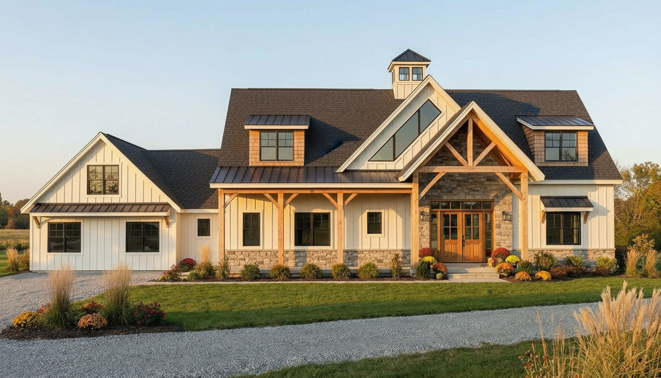 2 story country home no garage doors on front real cedar shake accents awning roof over garage windows and as appropriate add more detail character to the front do not make it look overpoweringly tall modern farmhouse barn dominium style with a touch of coastal cottage make it realistic both in concept and builder sense put garage section on left