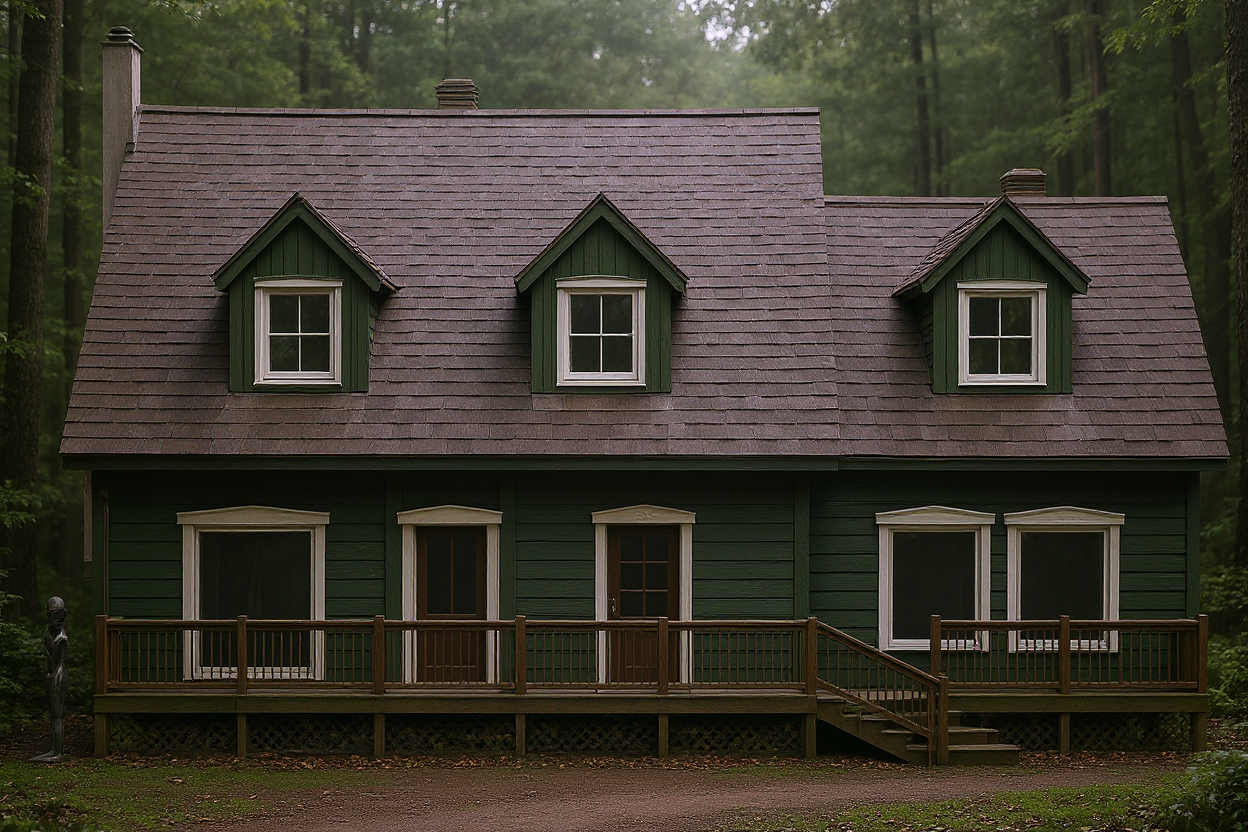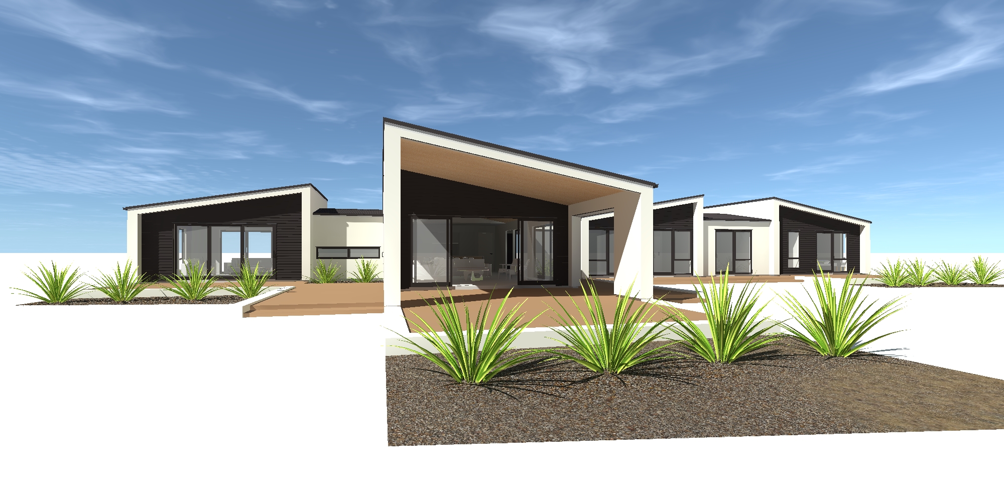 cameral angle pan right white plaster cladding with black weatherboard features black roof black window frames lawn low timber deck extensive native planting background trees sunset