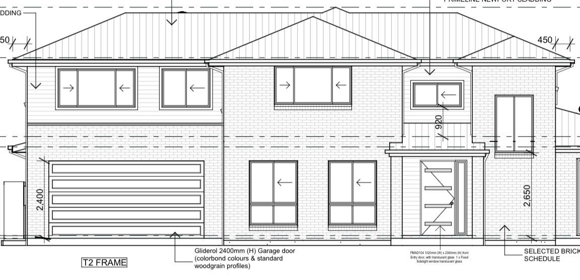 exterior shot hamptons style light grey bricks white weatherboard cladding dark grey roof black window frames black gutters and facia light oak timber garage door light oak timber front door blue sky australian native garden