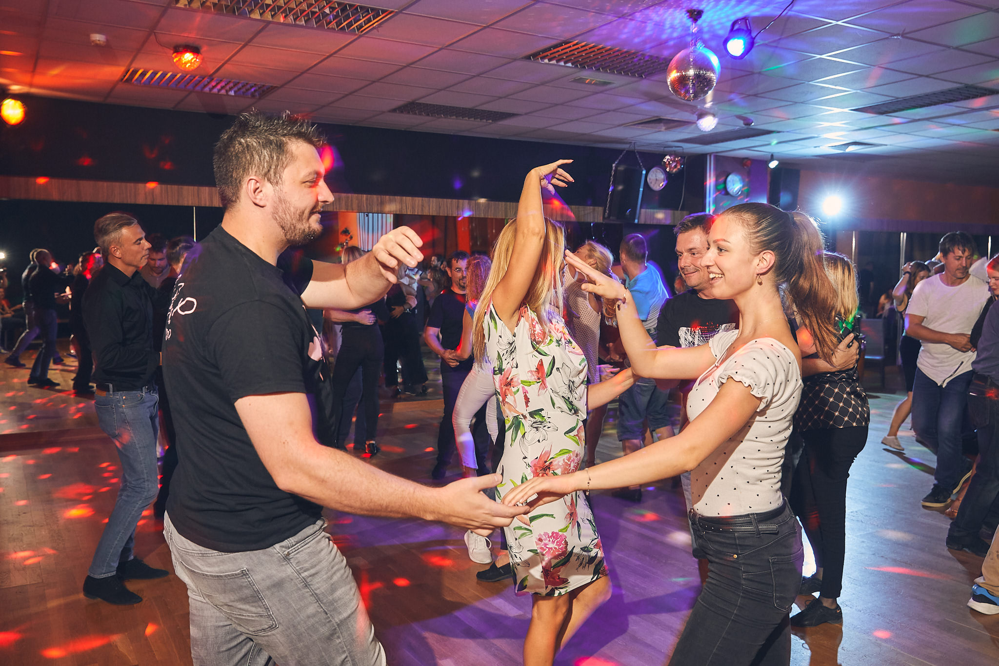 render a banner 16 9 ratio sensual dance couples romantic night romantic dark dancefloor with colourful lightshow contemporary dressed people