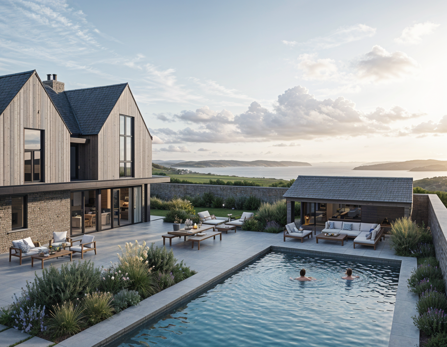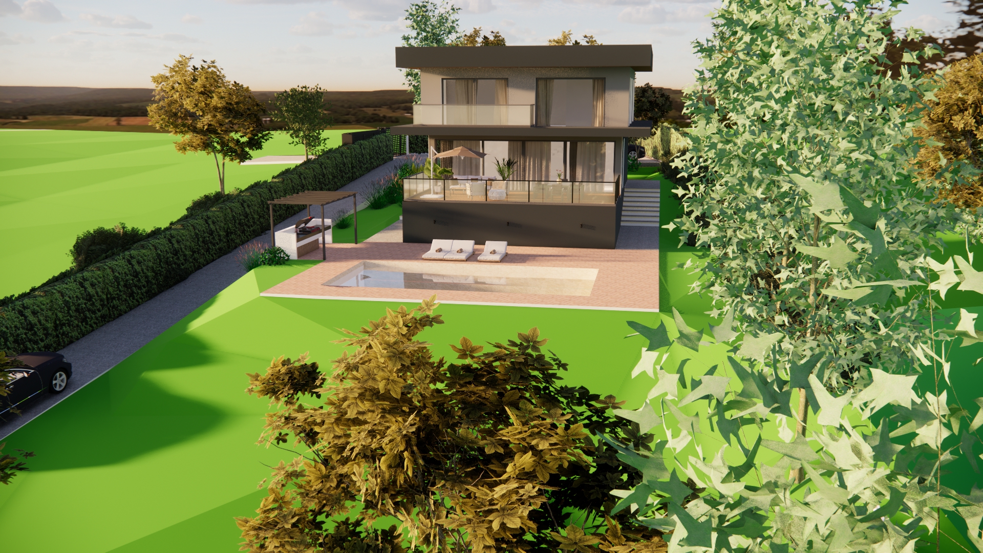 render a modern luxurious two story house with a sleek design the house facade features a balanced combination of light gray and charcoal gray aluminium tones large glass windows reflect the sunlight creating a warm and inviting atmosphere surrounding the house lush greenery in vibrant shades of green complements the modern architecture a stylish pergola with a light wooden texture stands beside an elegant outdoor swimming pool with water reflecting a clear blue sky the poolside is adorned with chic white chaise lounges create a serene and relaxing ambiance with soft afternoon sunlight casting gentle shadows enhancing the natural beauty of the landscape