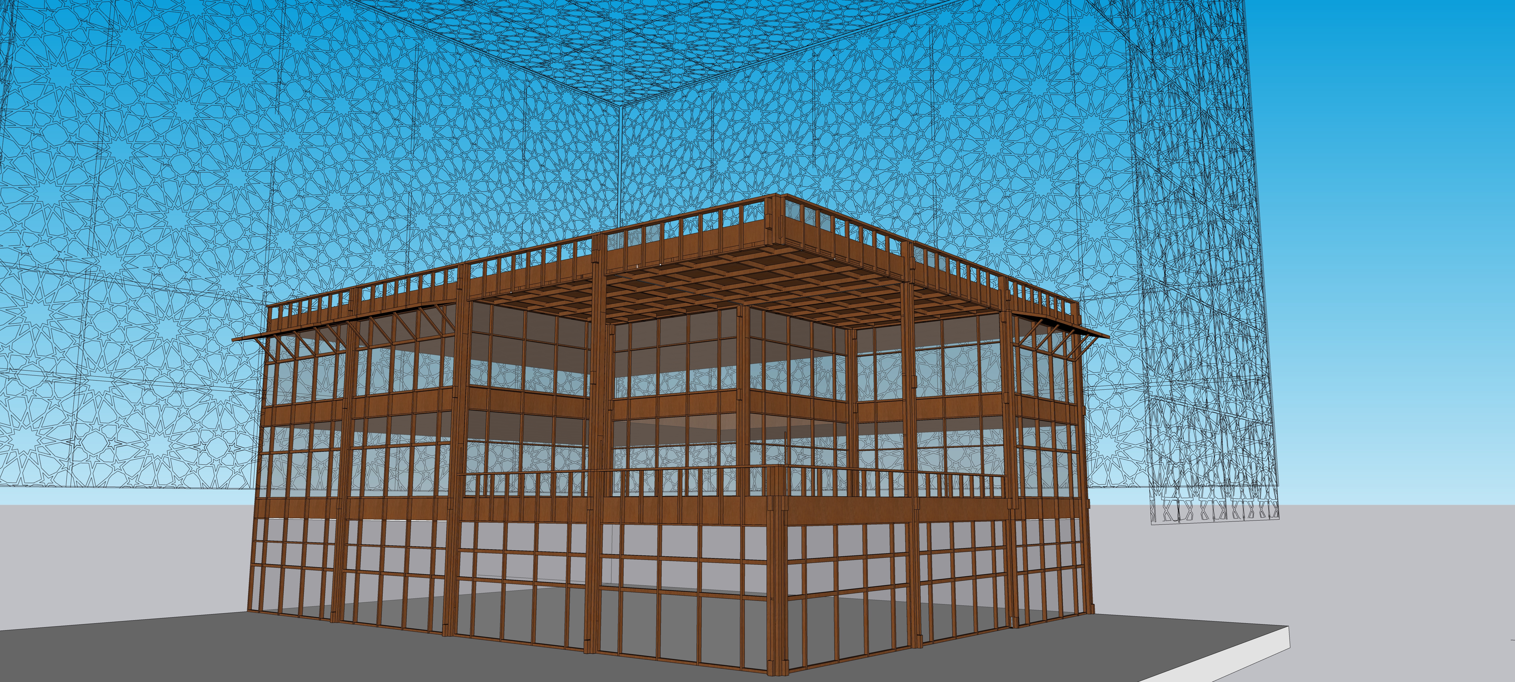 we are looking at a wooden modern and glass building on the ground floor it contains a food court and on the first and second floors there are vip areas this wooden structure is enclosed inside a 35 meter high atrium made of a mesh structure with arabic inspired patterns keep the same volumetric shape and proportions as seen in the reference image provided