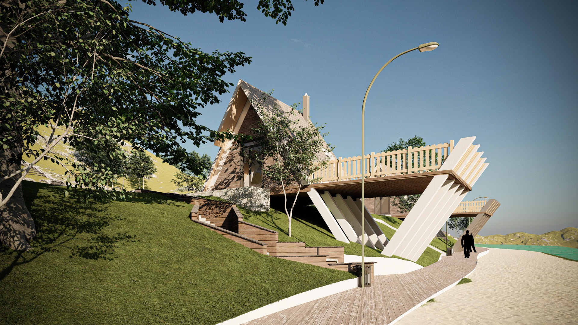 exterior shot create a realistic render with greenery use beech as the tree add people and add grass like in the picture let the render be identical architecture