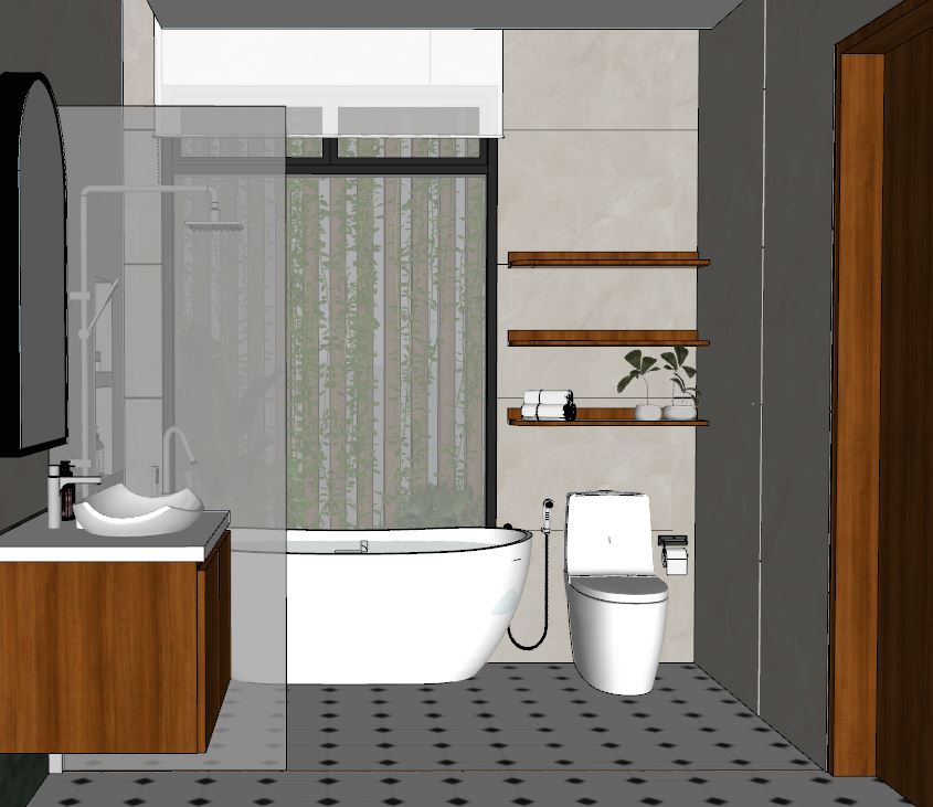 create ultra realistic images without changing any structure shape design or materials do not resize jpegs add indirect light to curtain valance and all around the mirror and add spotlight to ceiling and add soft outdoor light make the wall glossy and the floor is matte