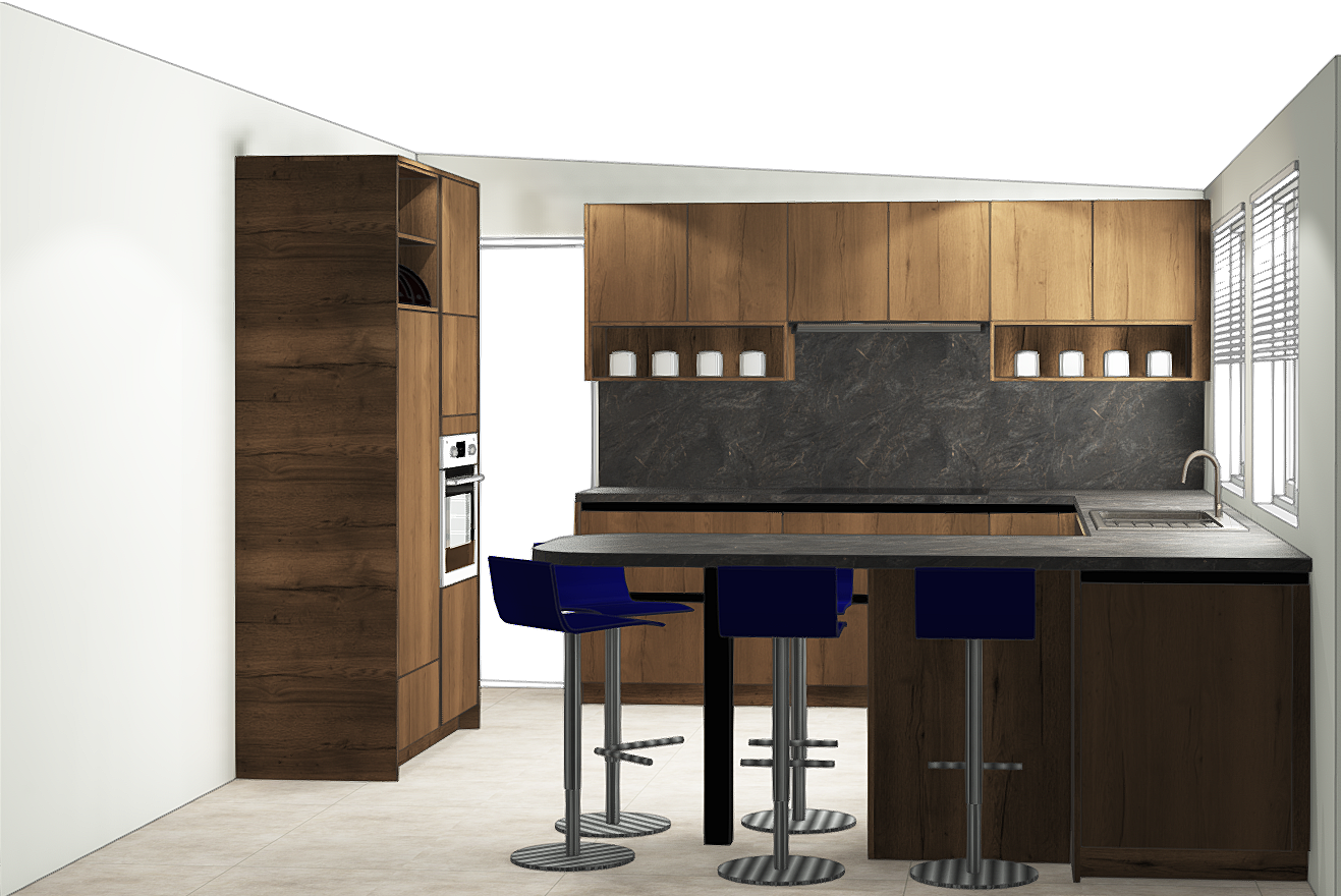 cr e un visuel ultra photor aliste de cette perspective cuisine conserve les proportions des meubles ne modifie absolument pas l implantation ou les dimensions des meubles tu peux y ajouter par contre un peu de d co mais conserve l originale garde une proportion paysage mais en respectant les dimensions initiales des meubles dans l image que je te fournis le rendu doit tre tr s r aliste et avec norm ment de d tails respecte par contre bien l implantation de la cuisine et ne rajoute rien