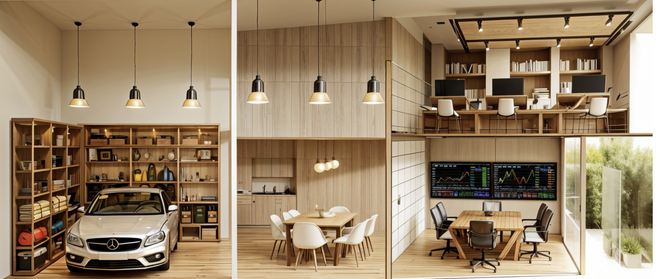 the shelves that are at the desks and computers are tvs not shelves all tvs are turned on to the stock market there is no hanging pendant above the dining table there are no timber walls above the ktichen