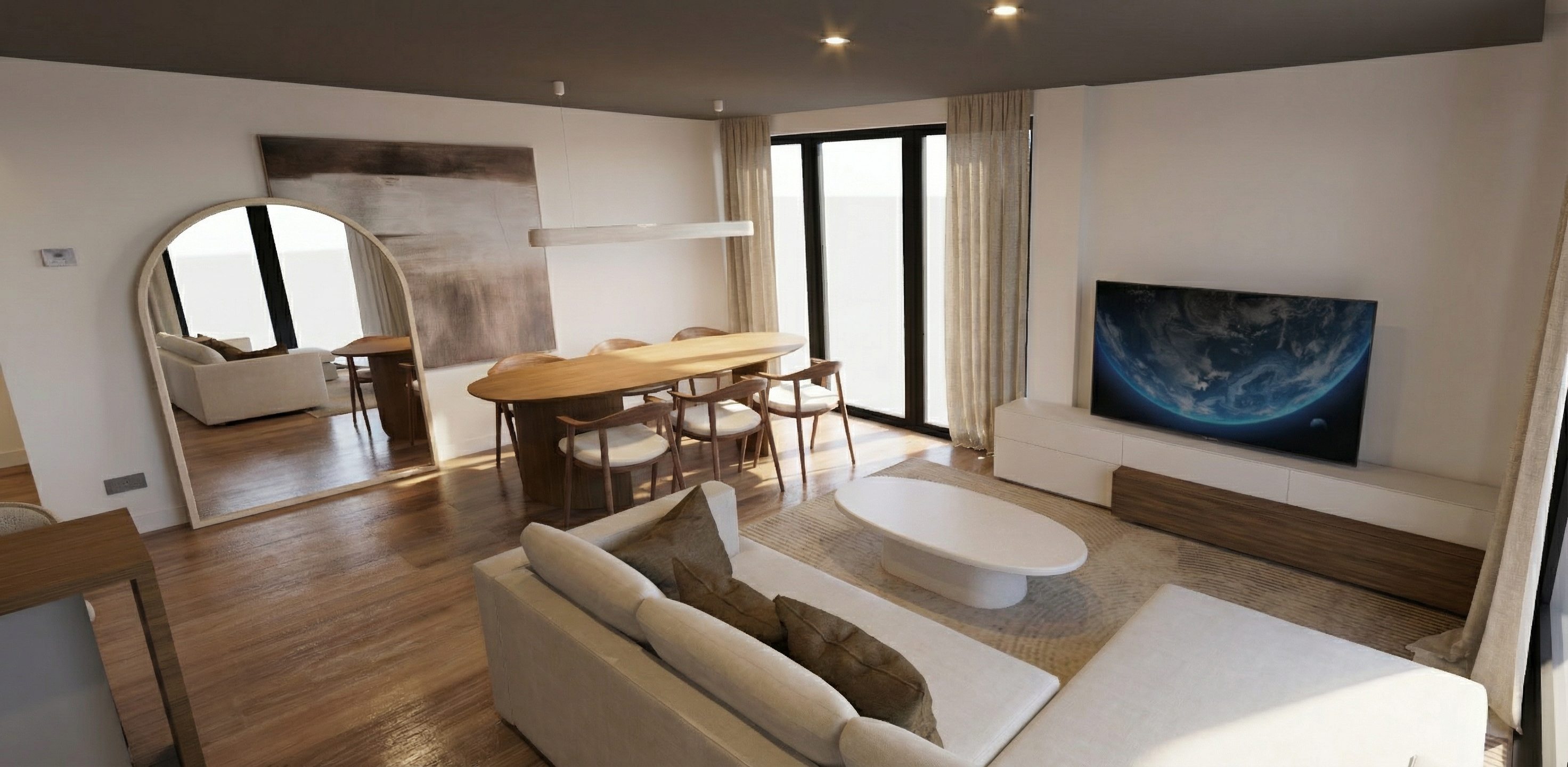 create a light beige wall finish with wooden wall paneling add a white entrance door with door trim of equal width on all three visible sides place a white radiator and install a cashmere colored board above the radiator on the left side add a built in wardrobe recessed into a niche flush and aligned with the wall the wardrobe should have two cashmere colored fronts with very thin black linear handles approximately 1 m long add a column aligned flush with the wall finished in beige place a cashmere colored cabinet with seven drawers featuring horizontal black linear handles the first drawer on the left should function as a seating niche with an upholstered navy blue cushion while the remaining six drawers form a closed cabinet above the cabinet place a framed picture with a white frame and white passe partout accompanied by two bronze wall lights remove the white shelf below the picture ensure all elements are aligned minimal and clean do not add any extra furniture accessories plants colors shelves or lighting keep proportions layout and materials exactly as specified