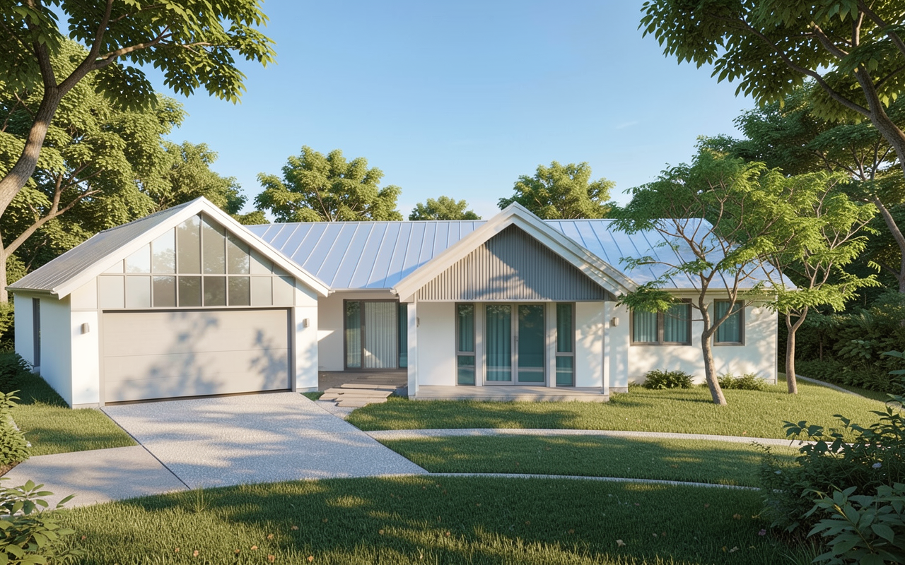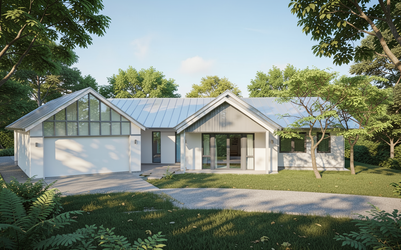 create a photorealistic architectural visualization based on the provided image preserve the building s geometry shape proportions window placement and all elements without any changes do not modify the architecture and do not add or remove any structural elements enhance only the visual aspects materials glass tile wood lighting shadows reflections environment realistic sky trees and high quality textures style provans architectural visualization photorealism soft lighting high detail 4k