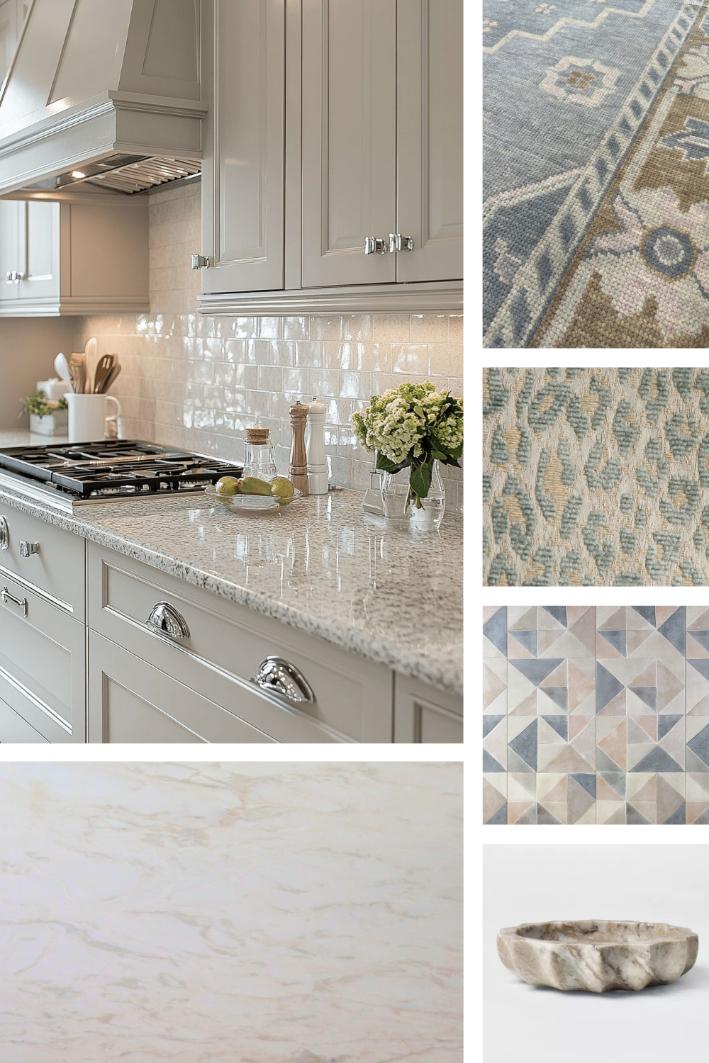 render a high end designer bathroom from the moodboard featuring a slab of calacatta zambia marble as the countertop and shower walls show any light fixtures as illuminated and add warm sunlight from nearby windows ensure there are several plants around the space and a companion wallpaper feature behind the vanity zambia marble features pale white background with taupe grey and blush veins