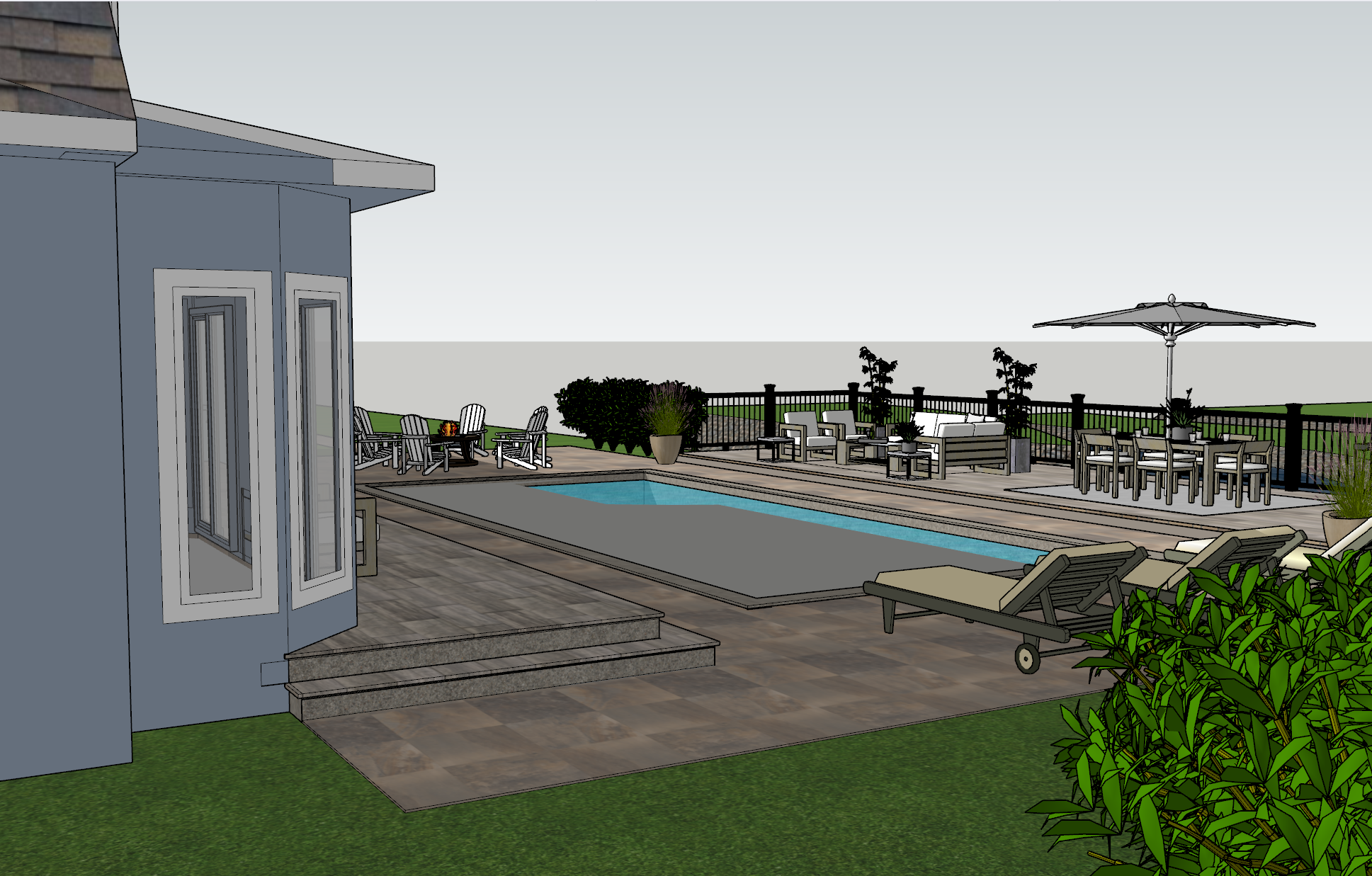 forest background porcelain tile patio stucco house fire pit in center step up deck