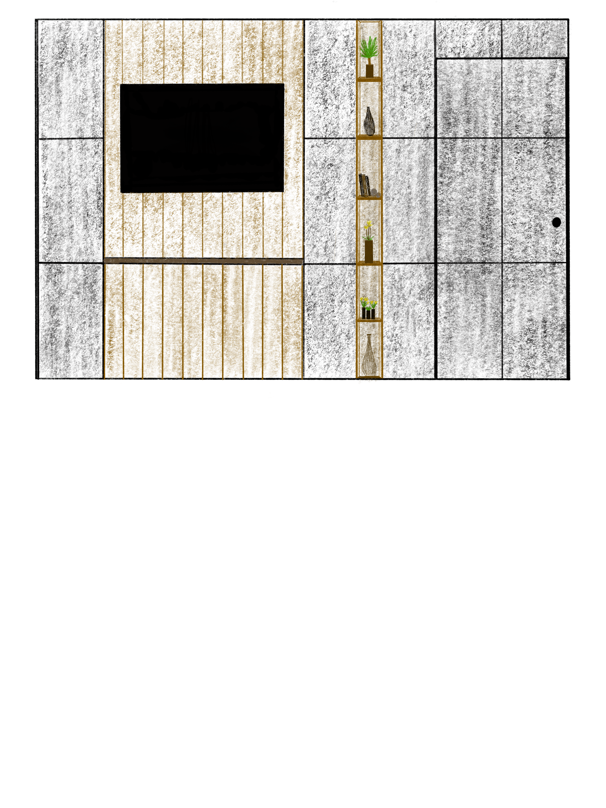 the floor to ceiling black cabinets will be 12 deep leaving the insert for the mounted tv to be backset 12 with a wood paneled accent as well as the smaller inset open shelfing