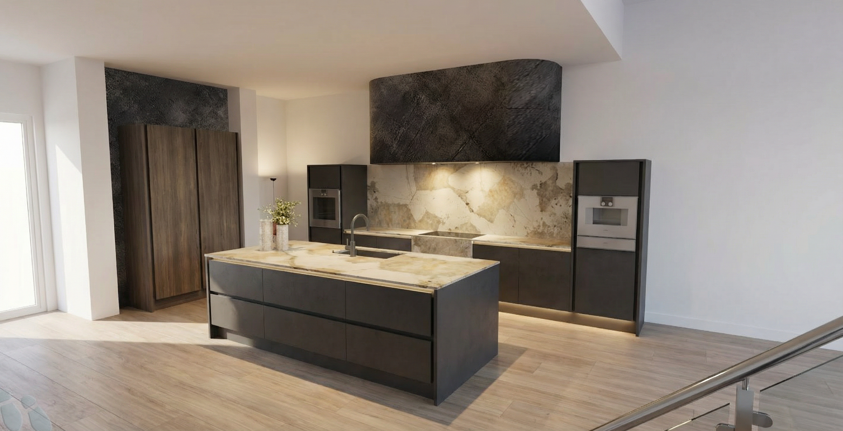 create a photorealistic render of the bathroom based on the provided 3d screenshot keep the exact geometry layout and camera perspective do not move resize or add any new structural elements apply realistic materials lighting and reflections to all surfaces wall and floor tiles light beige subtle stone texture matte bathtub fixtures add a brushed gold concealed wall mounted faucet and handle aligned naturally above the bathtub outside the window add a realistic background with tree canopies and sky as seen from an upper floor lighting soft daylight led ambience natural reflections in glass keep the mood elegant warm and modern like a luxury spa do not modify geometry or object placement