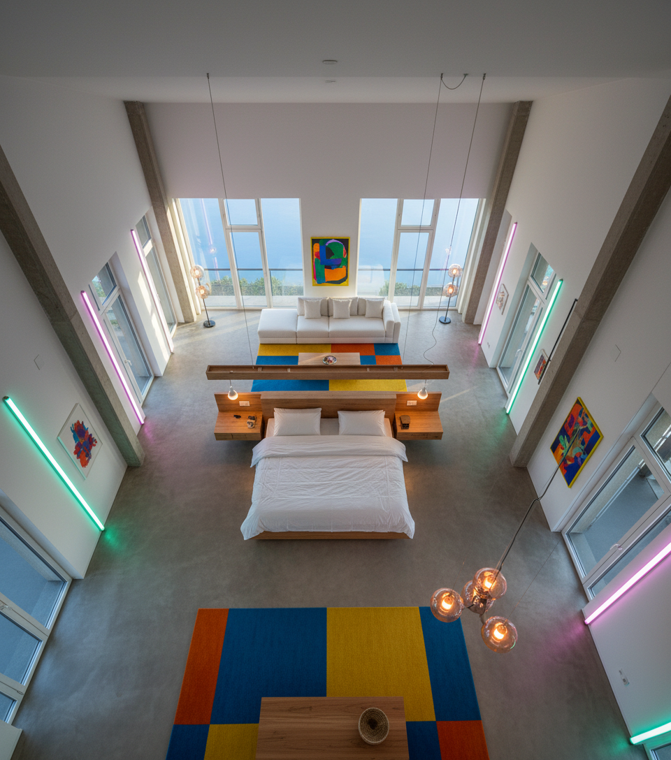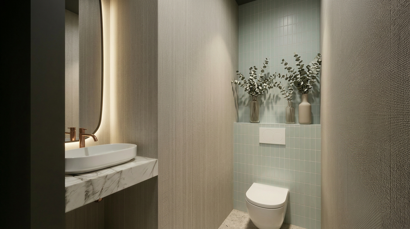 exterior shot use the exact same mirror and placement as the moodboard remove wood on side wall toilet should be on opposite vanity wall pointing to the planter