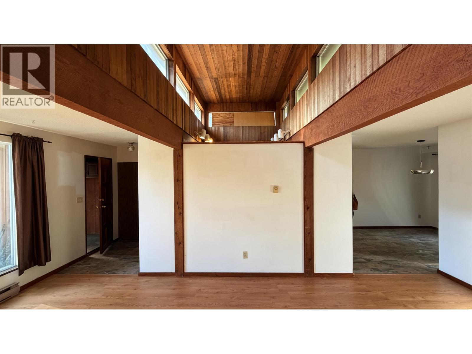 modern interior shot open the center wall up between the wood columns and make it a black kitchen island make the floors light wood and have the background behind the island be a black and white kitchen remove all wood from walls and make white make the space more modern add potlights throughout and pendant lights over the island architecture