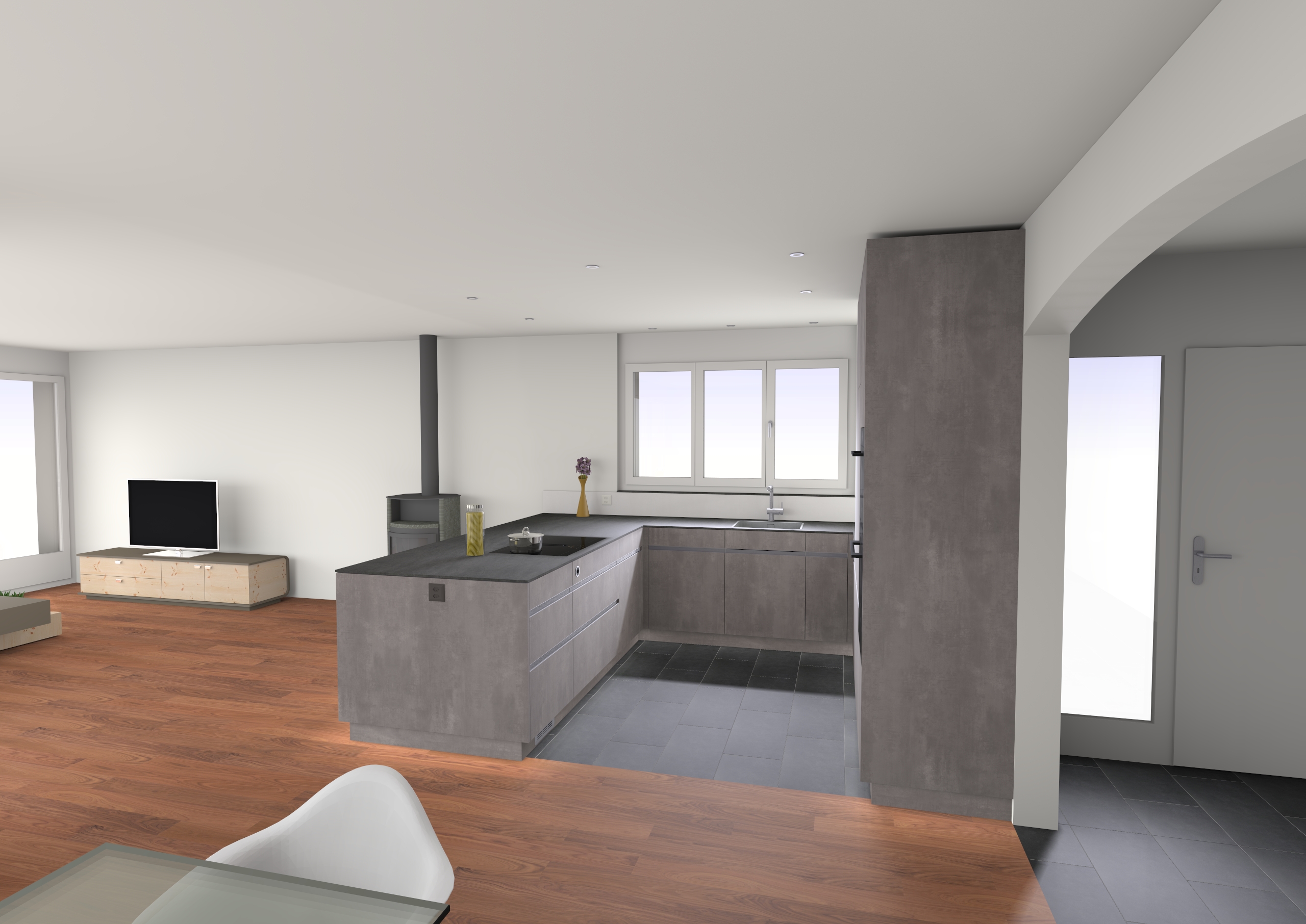 f ge einen realistischen au enhintergrund durch die vorhandenen fenster ein garten im erdgeschoss mit rasenfl che dezenter bepflanzung hecken b sche vereinzelte b ume perspektivisch korrekt und passend zur vorhandenen kameraposition strikte restriktionen h chste priorit t es d rfen unter keinen umst nden neue fenster ffnungen oder glasfl chen hinzugef gt werden insbesondere darf links vom kamin kein zus tzliches fenster entstehen die bestehende architektur w nde ffnungen durchbr che proportionen ist unver ndert zu belassen jegliche geometrische ver nderung ist verboten inkl verschieben skalieren oder erg nzen von bauteilen falls eine anpassung nur durch hinzuf gen eines fensters m glich w re nderung nicht durchf hren vorh nge nur an der linken balkont r einen leichten halbtransparenten vorhang hinzuf gen wei oder hellgrau weich fallend am k chenfenster ausdr cklich keinen vorhang hinzuf gen keine zus tzlichen textilien irgendwo anders licht au enlicht als weiches tageslicht konsistent mit der innenbeleuchtung keine dramatischen schatten oder neue lichtquellen stil fotorealistisch architektonisch korrekt negative constraints zus tzlich keine neuen fenster keine neuen t ren keine zus tzlichen ffnungen keine nderung der wandstruktur keine ver nderung der szenegeometrie