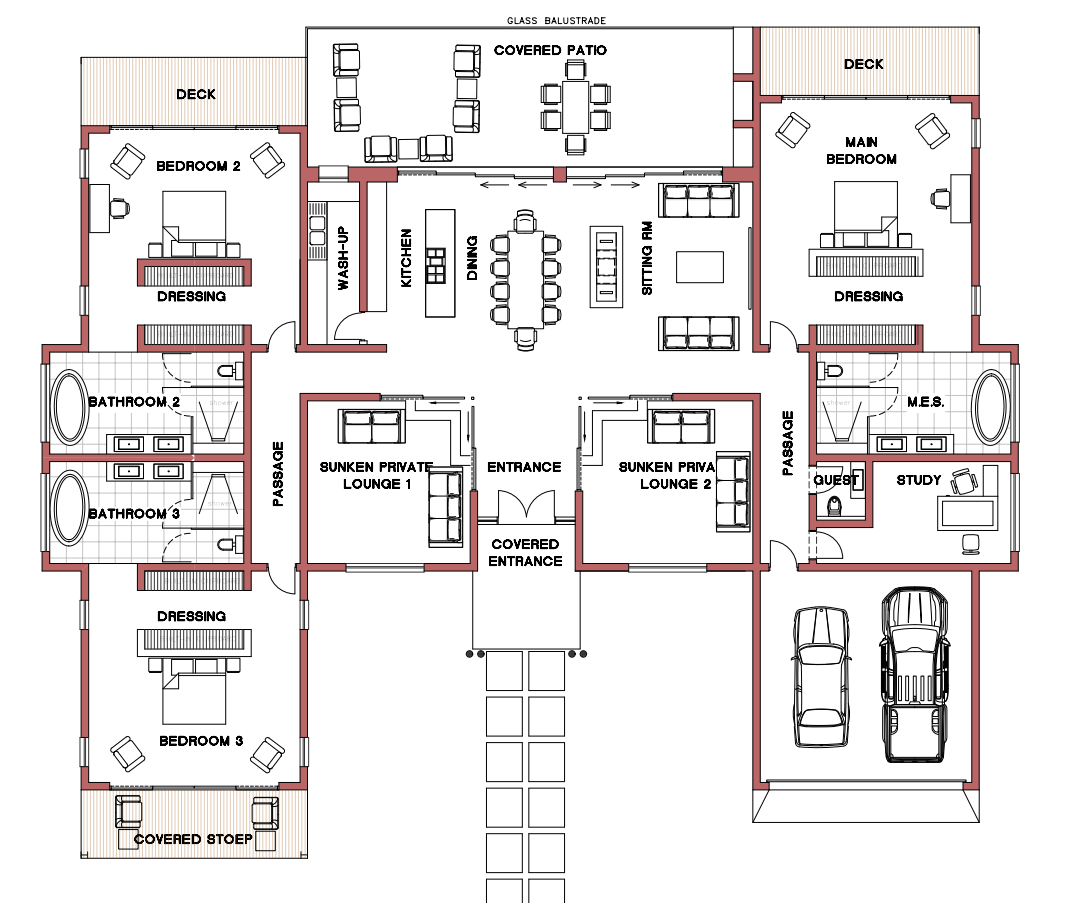 convert this floor plan into a realistic isometric 3d view of a full house show the space from an elevated angle with furniture walls and details visible render a modern residence neutral colour polished concrete floor in bushveld use the same furniture as shows on the plan do not change the orientation of the floorplan