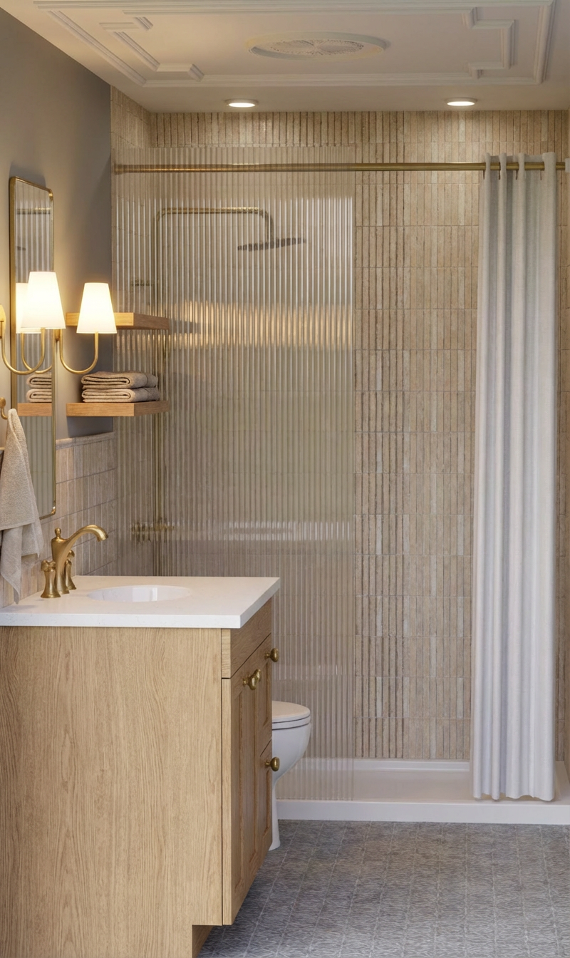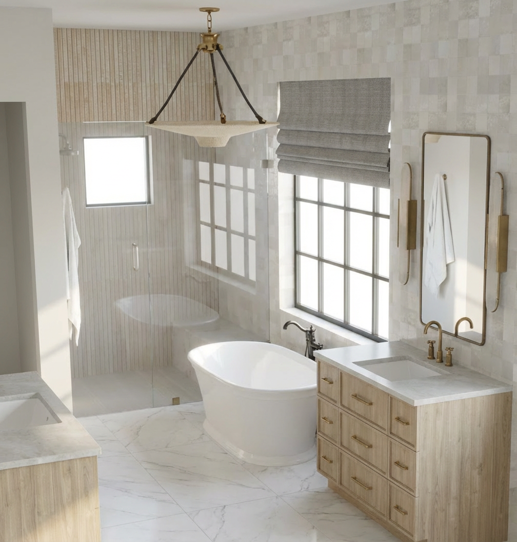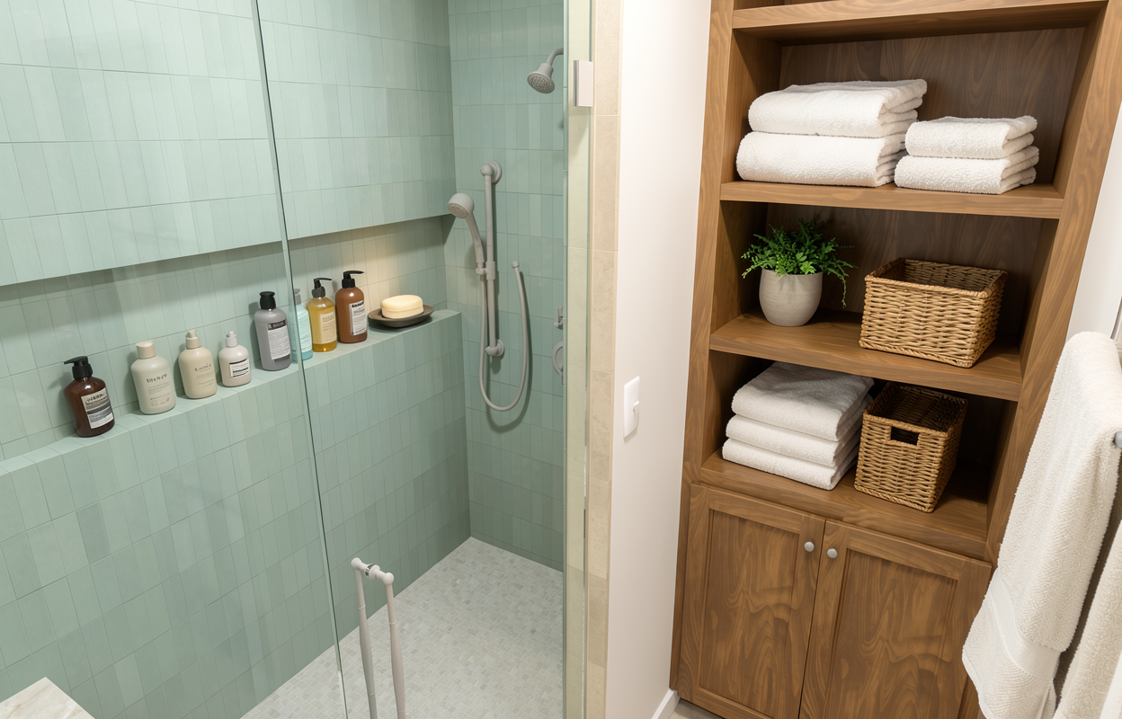 bring life to this serene bathroom scene add shampoo bottles and sops to the shower niche in the shower on the left do not add towels in the shower add towels only to the right of the white wall in the linen cabinet and on the wall to the very right of the scene on the towel rack use neutral serene colors for the bottles and only a few of them next to a soap dish and soap sitting in it add stacks of towels and neat baskets in the walnut linen cabinet add ambient natural light coming from the direction of the camera lens add a couple of small plants in the linen cabinet change the mint green tile to a more rustic deeper sage green with handmade elements like tan patina