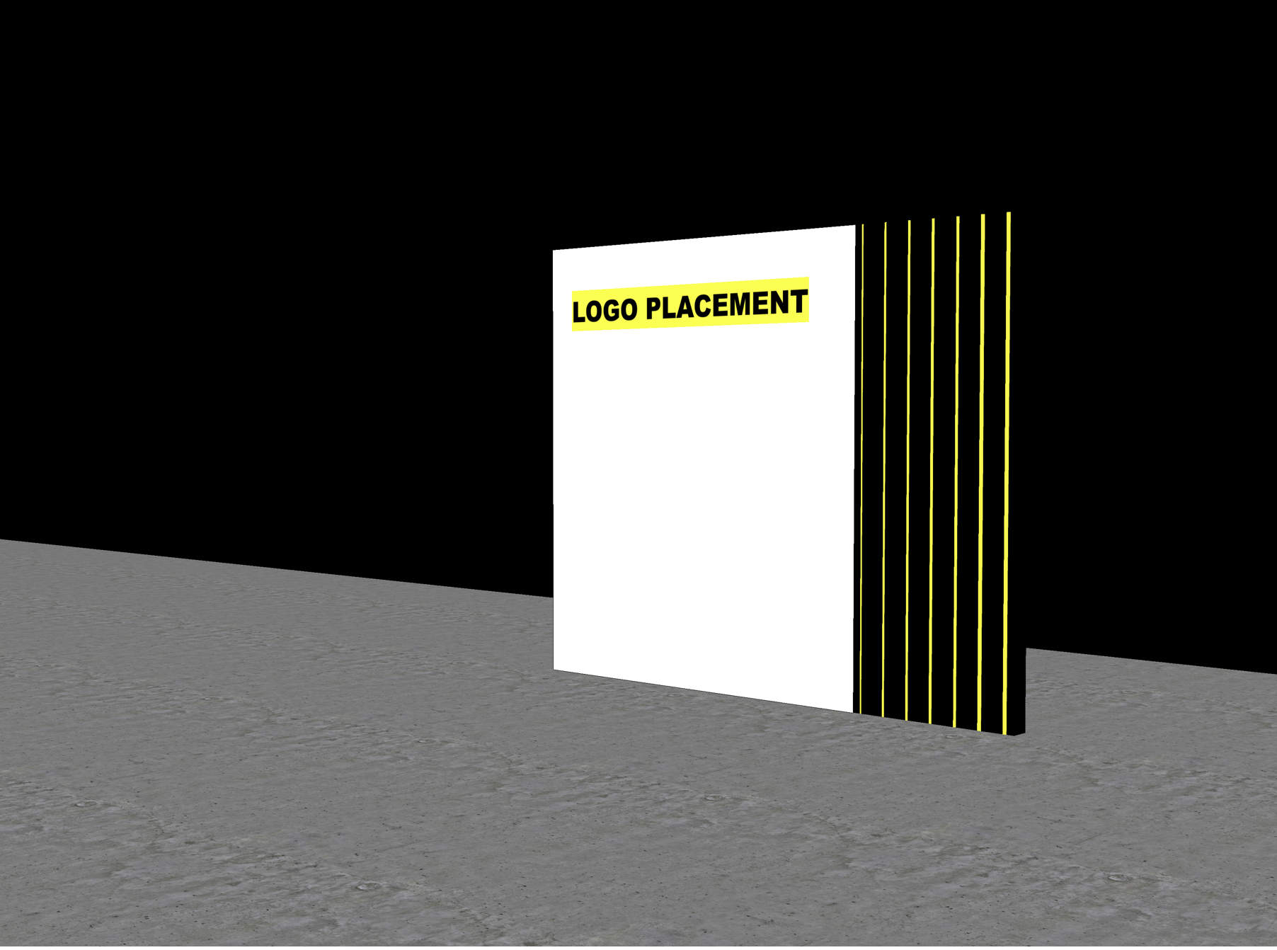 immersive stage environment with light tubes on the side enlarge design replace black background with straight black curtain drapes polished concrete floor interviewer interviewing two business people with yellow lanyard both standing in front of the wall blurred business people with lanyard walking past