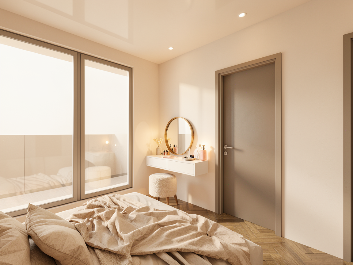 make the lighting a little warmer keep the details exactly as they are make the tile lines more evident on the floor but keep the same tile sizes as the base image add the appropriate shadows so that it is photorealistic
