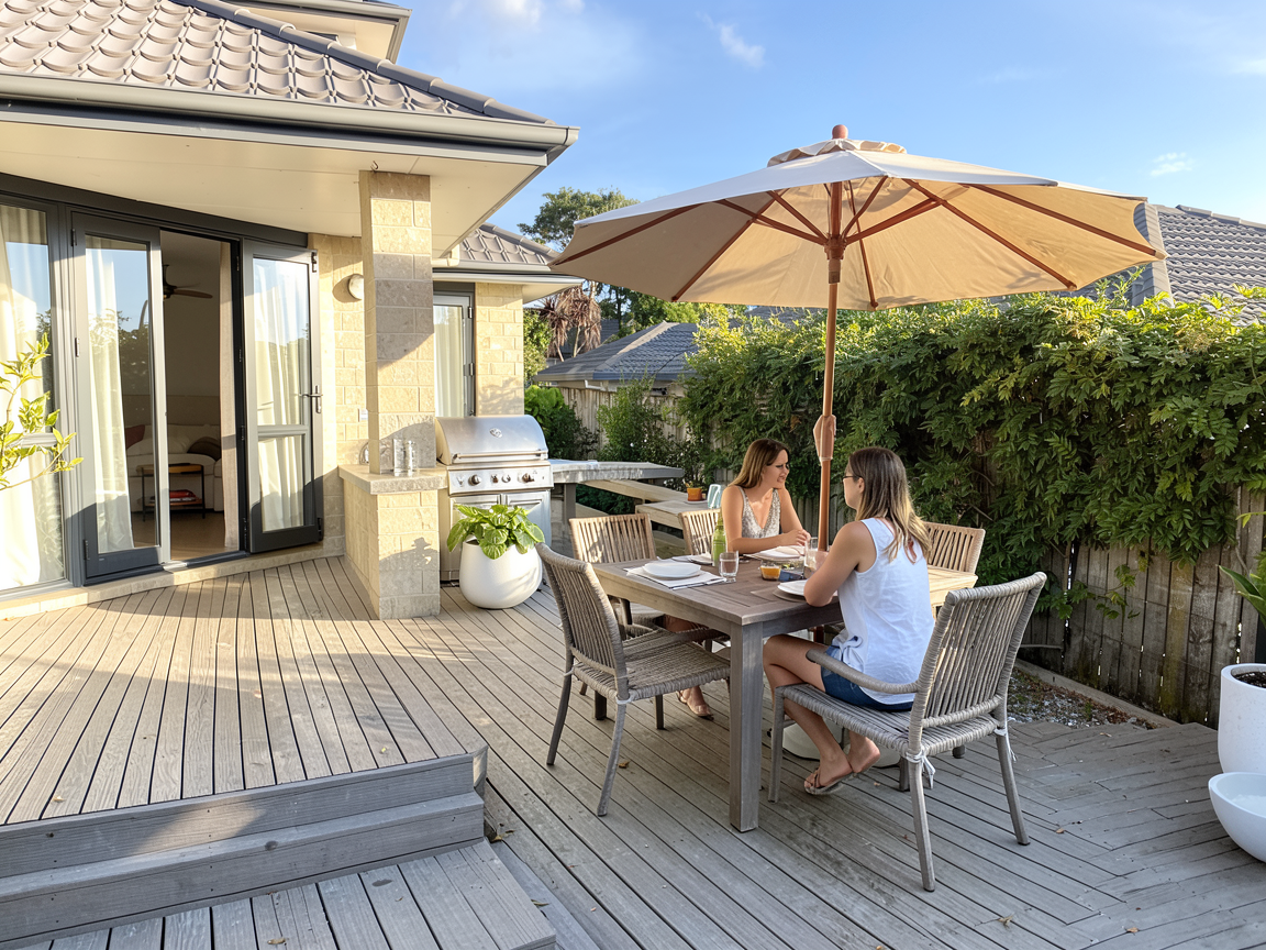 widen the top deck over to the right and add an outdoor kitchen with barbecue on top level