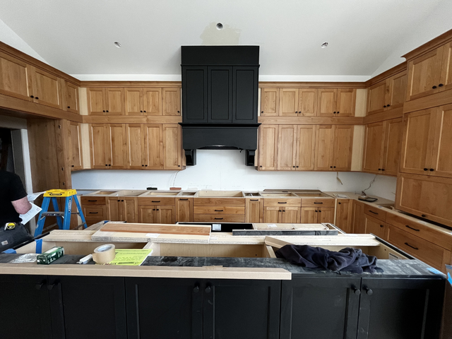 do not change the cabinets in any way preserve the exact cabinet colors materials finishes dimensions door and drawer styles hardware spacing alignment and all geometry exactly as shown do not alter the countertop shape backsplash appliances flooring lighting fixtures or wall structure only remove the construction materials clutter and mess from the scene clean the room and make it look finished and staged add a few simple tasteful home accessories appropriate for the style of the space but do not add or remove any furniture windows or architectural elements maintain the original lighting direction and realism enhance clarity and polish the photo while keeping the cabinetry and room design completely unchanged do not alter the lighting to keep the cabinet colors as they are in the image add white countertops stage for a kitchen make the upper fillers match the upper cabinets