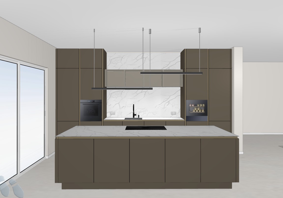 das ist eine k che front farbe von den schr nken umbra griffleisten mit beleuchtung ober und unter der glasvitrine beleuchtung