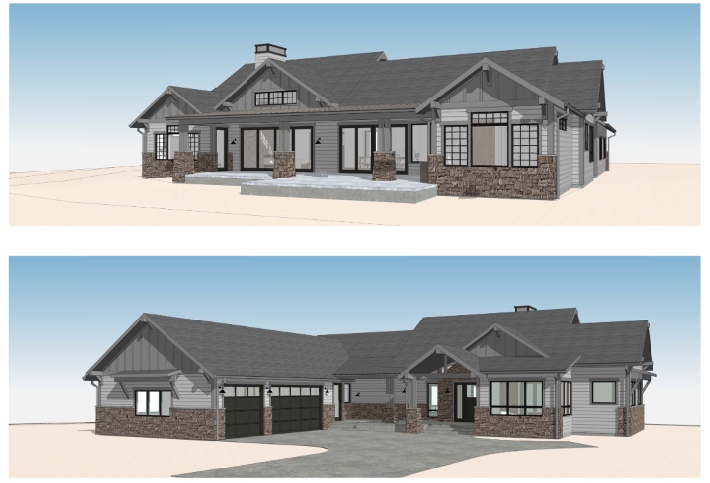 create a stunning architectural rendering of a modern craftsman style house the exterior features include a grey gabled roof and contrasting light grey horizontal siding incorporate dark grey or black accents for the trims and window frames the stone elements on the foundation and columns should be a natural earthy brown with varied textures the garage doors should be deep charcoal grey adding a sleek modern touch the surrounding landscape should evoke a serene suburban setting with lush green lawns and well maintained shrubs include a bright blue sky with soft fluffy clouds to create a calm inviting atmosphere use warm sunlight to enhance the textures and colors casting gentle shadows for a realistic effect