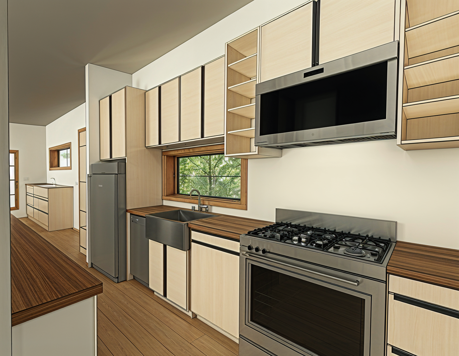 a photo realistic interior perspective shot of a light wood kitchen stainless steel appliances electric stove dark stained butcher block countertops light colored walls light wood casework and nice hardwood floors