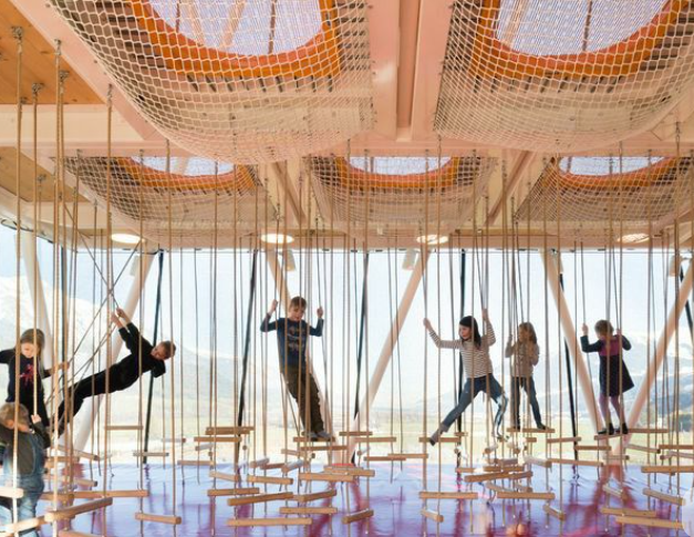 interior shot instalations for playing for kids big balls in the back used for pushing and playing