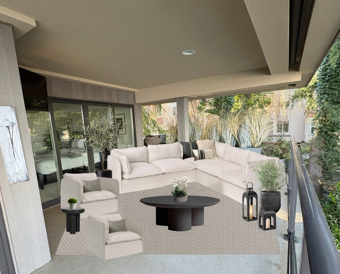 this is a mood board of furniture overlayed on top of the actual space can you make the image look more realistic with the exact furniture in this image also adjust the placement so that the long end of the sectional to running parallel to the sliding glass dooe behind it adjust all other furniture accordingly