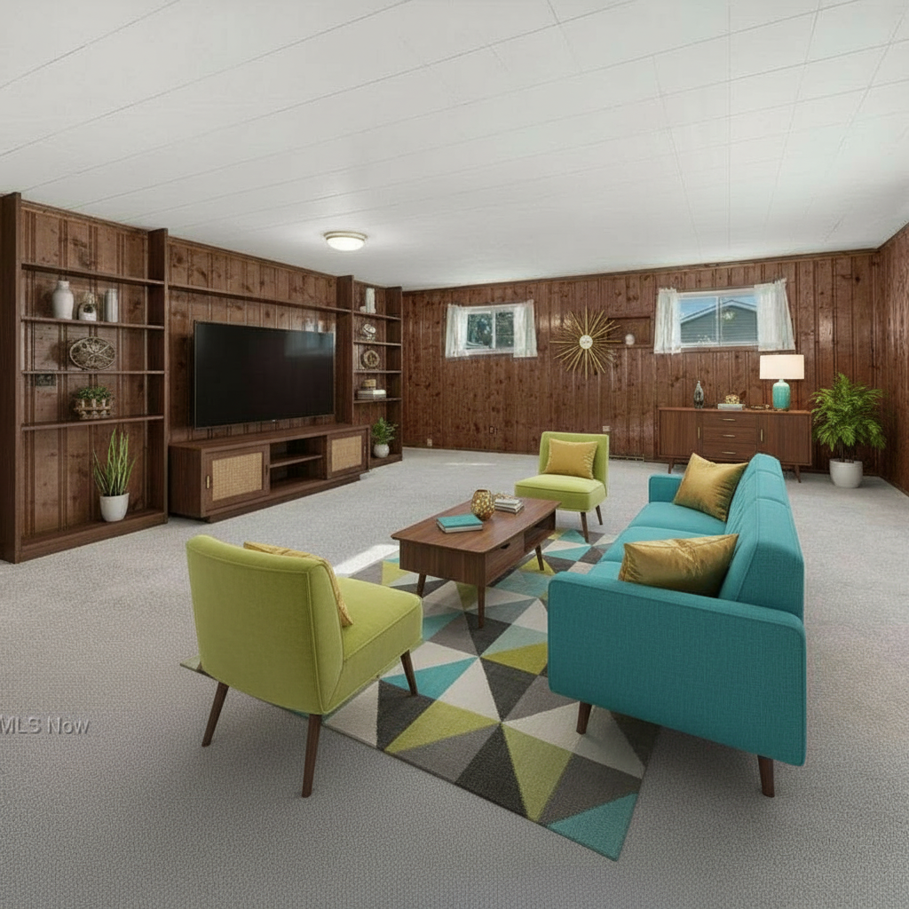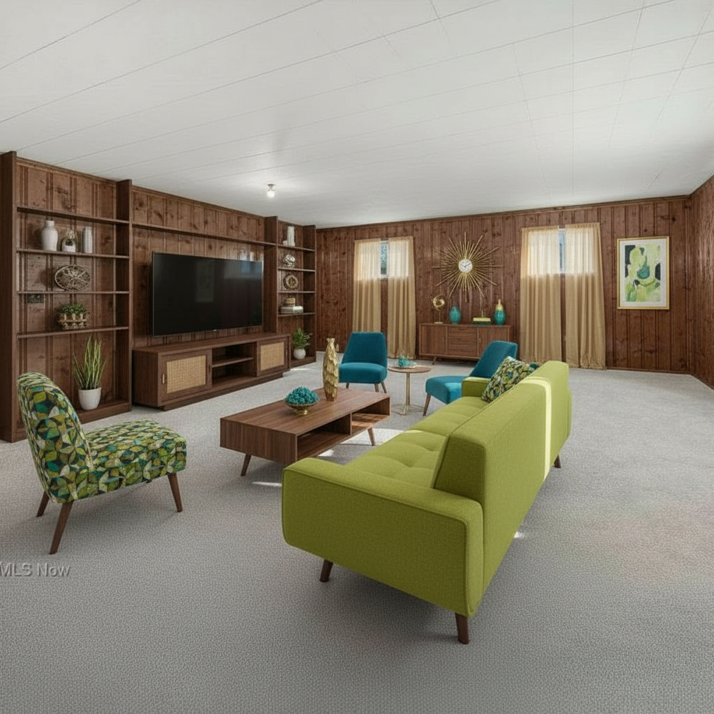change the lighting to create a warm and cozy atmosphere add midcentury modern style wall sconces on each side of the windows