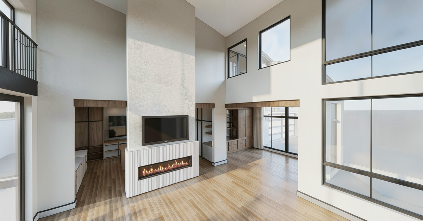 a beautifully rendered modern living room with high ceilings and large windows use a soft warm beige for the walls and rich walnut brown for the wooden elements like the cabinets and trim the floor should be a light oak wood adding warmth to the space render the windows as transparent with a gentle reflection of a blue sky the fireplace should have a sleek chrome frame with a realistic flame in hues of orange and red the tv should have a matte black frame set the atmosphere to be cozy and inviting with soft natural light streaming through the windows
