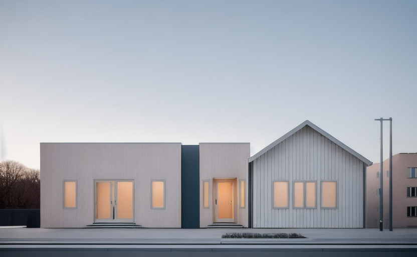 render a beautiful and modern three story house with a light blue metal roof and off white walls add large windows with light brown frames and emphasize the round staircase in elegant dark gray use soft golden hues for the vertical supports and balconies creating a warm and inviting atmosphere surround the house with a calm serene and slightly hazy background in pastel shades evoking a peaceful morning ambiance