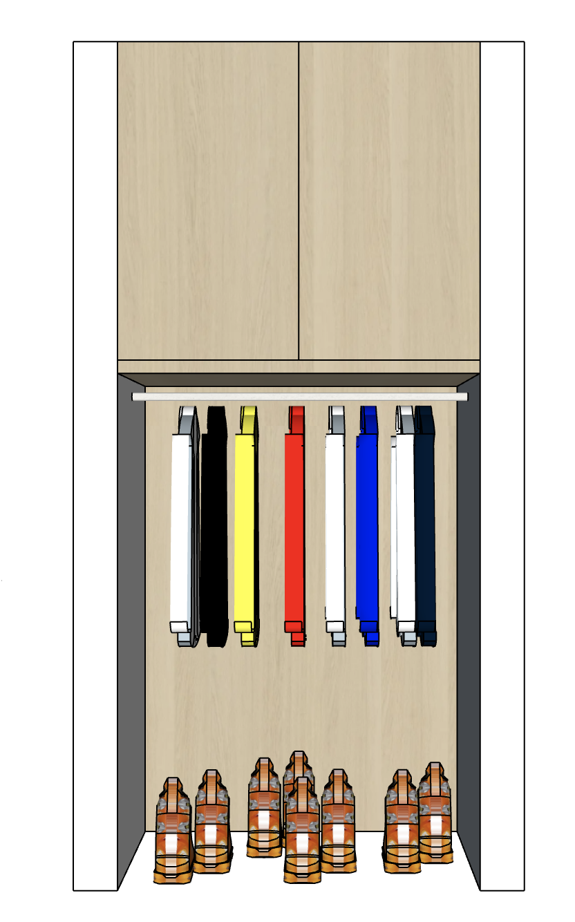 closet flat slabe upper white oak millwork hanging bar for coats ski boots below no window on right