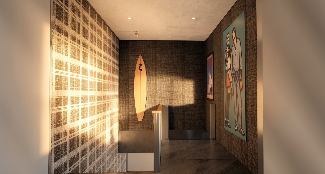 imagine a modern two story house with a dark gray steep roof and a rubbed warm mid gray capicino and darker gray beige plaster and dark narrow brick inserts matching the roof color between the windows on the right which are set back 4 cm from the plane with brick exterior walls the mood is gloomy yet calm with soft lighting and a slightly dramatic sky the house is surrounded by lush green foliage which contrasts with the elegant black silk gloss metal fence and gate in the foreground the sidewalk in front of the gate is a little neglected very slightly weedy but neat and tidy in front of the fence a medium sized car is parked in the driveway the preserve the peaceful suburban environment in the background are family houses with a central european feel the neighboring plot on the right is empty with smaller trees with overgrown grass scattered on the gravel path in front of the gate the sidewalk is a bit neglected slightly weedy after rain mood with a few small puddles in which the house is struggling the sky is cloudy with filtered sunlight that creates lattice shadows make an ultra realistic rendering with slightly softer lights and a little fog