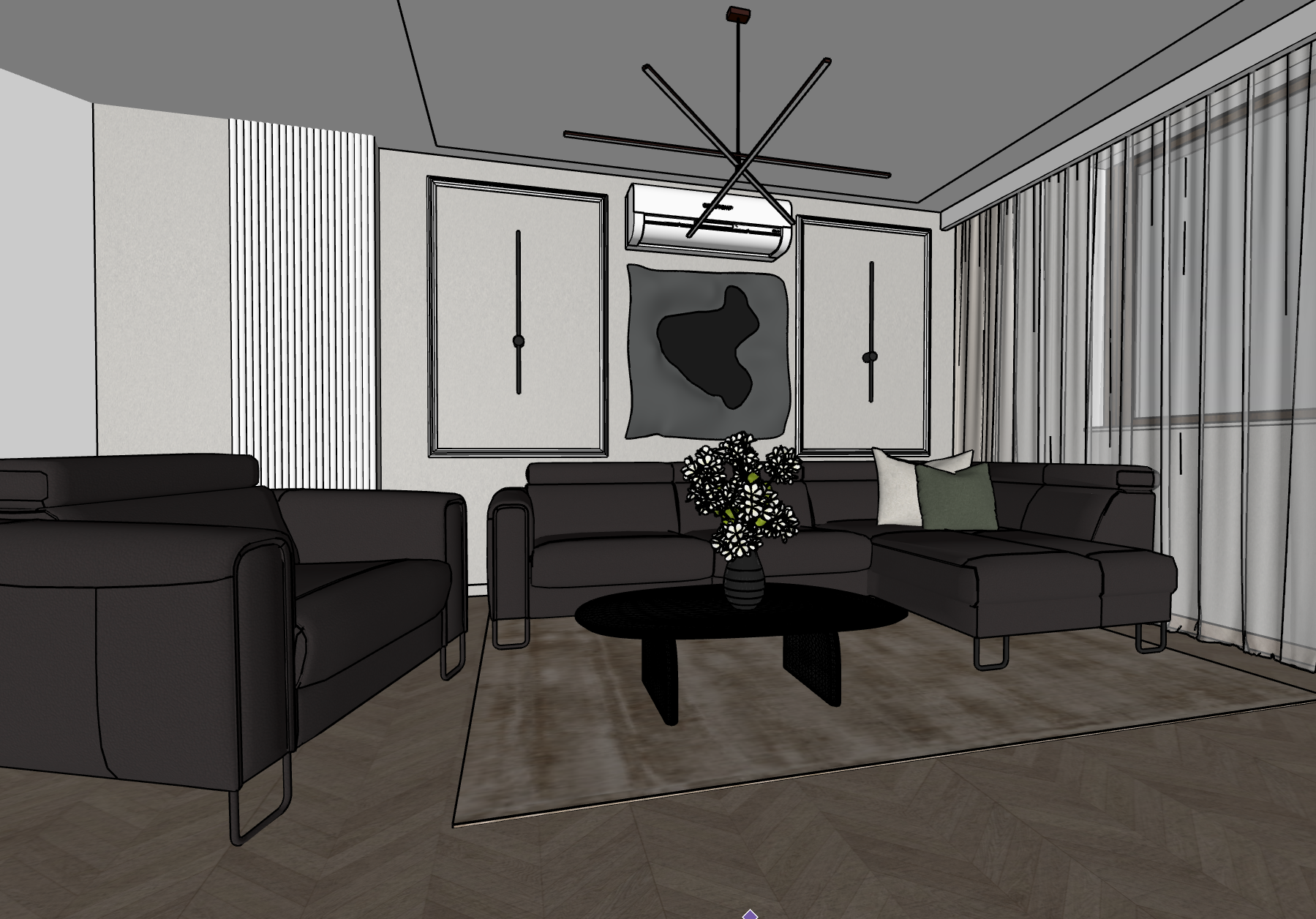 zr b realistyczna wizualizacj nic nie dodawaj zadnych lamp do wisz cej lampy dodaj swiat o tak samo do czarnych kinkiet w na cianie lustro na scianie ma byc srebrne 3d swiec ce zr b bezowy dywan mocno ciemna kanapa i fotel ze sk ry stolik kawowy z czarnego drewna bezowa pod oga z jode ke dodaj ledy na suficie wok sufitu