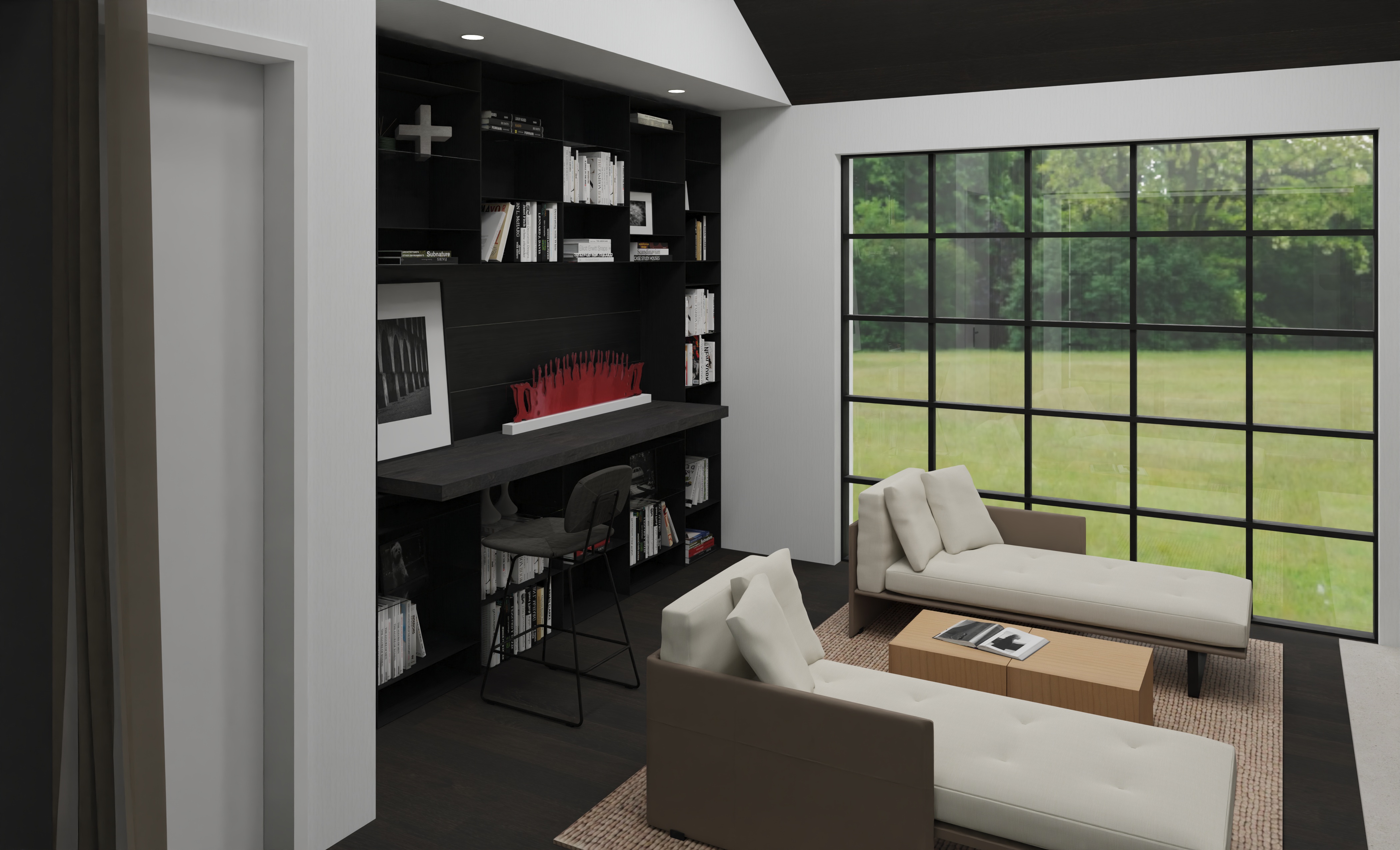 a modern minimalist library design dark oak flooring and matching ceiling complements black wood cabinet that have no lighting within them with a matt black fossil wood desk top and soft seating the design the atmosphere is calm and relaxing accented by lush green hydrangea plant outside the window with lighting that is soft and natural creating a relaxing atmosphere