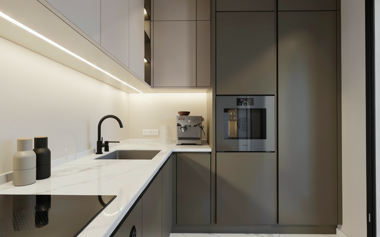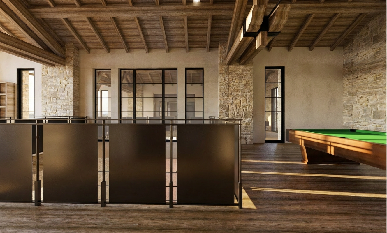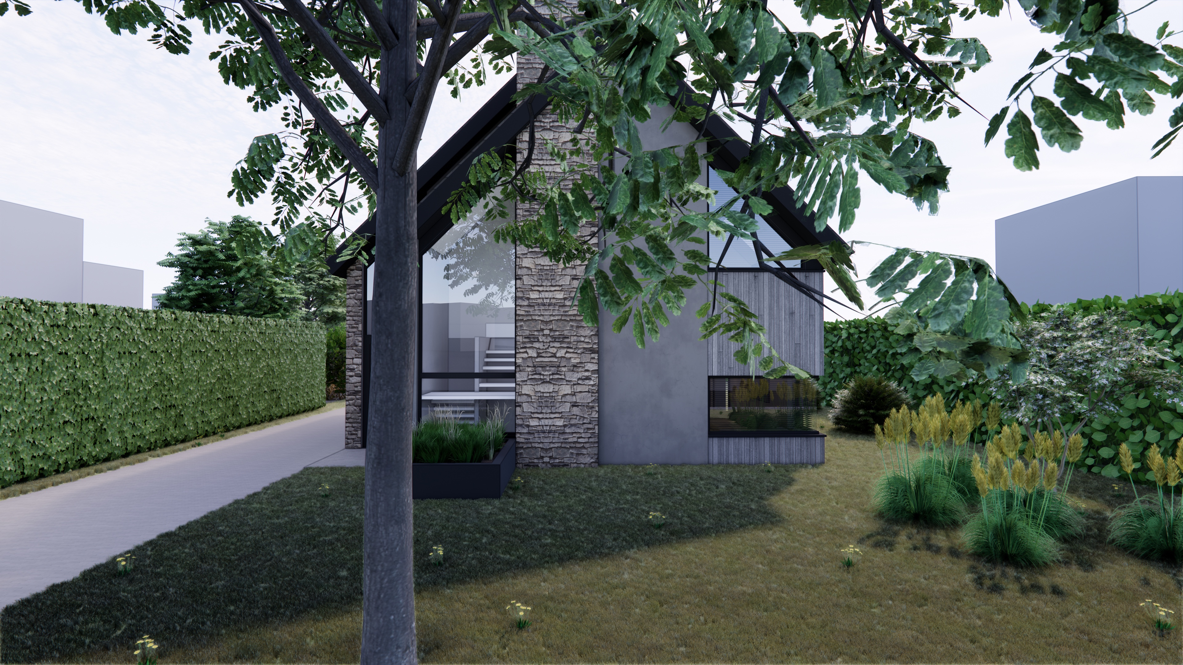 high detail architectural photograph of the specific modern house in image 0 png viewed from the same angle the grey timber cladding on the right must feature deep intricate and weathered wood grain texture with pronounced vertical depth the central natural stone chimney stack must have profound textural relief with individually articulated rough hewn flagstones showing deep shadows and varied colorations the dark grey roof tiles must be highly detailed individual tiles with clear depth visible interlocking seams and subtle imperfections include precisely rendered dark grey gutters and integrated vertical downpipes following the eave lines all windows are highly transparent showing subtle deeply shadowed interiors the foreground flowering bushes and tall grasses must have lush hyper realistic intricate foliage with fine detail the lawn is dense and textural the surrounding context buildings remain simple geometric blocks lighting is a soft warm natural daylight from a sun subtly veiled by light wispy scattered clouds in a bright sky the atmosphere is serene and photorealistic highly detailed textures