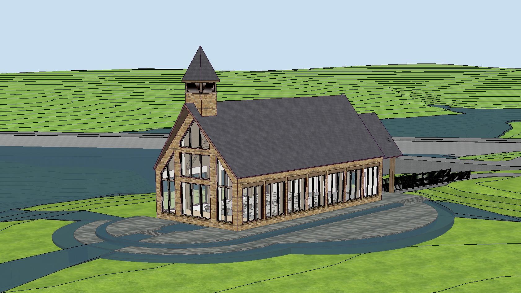 chapel in a large forest with water around it step down patio with water between