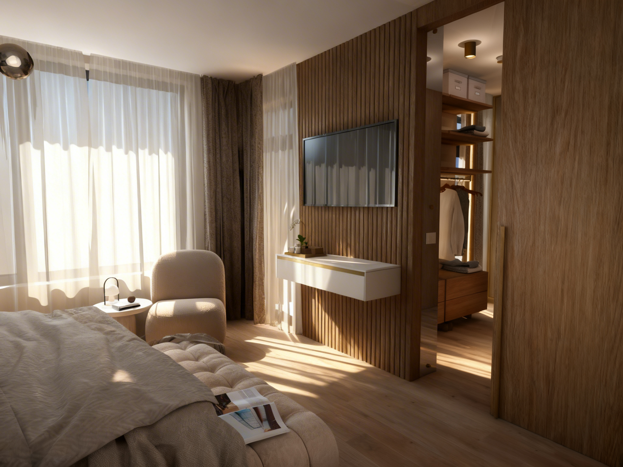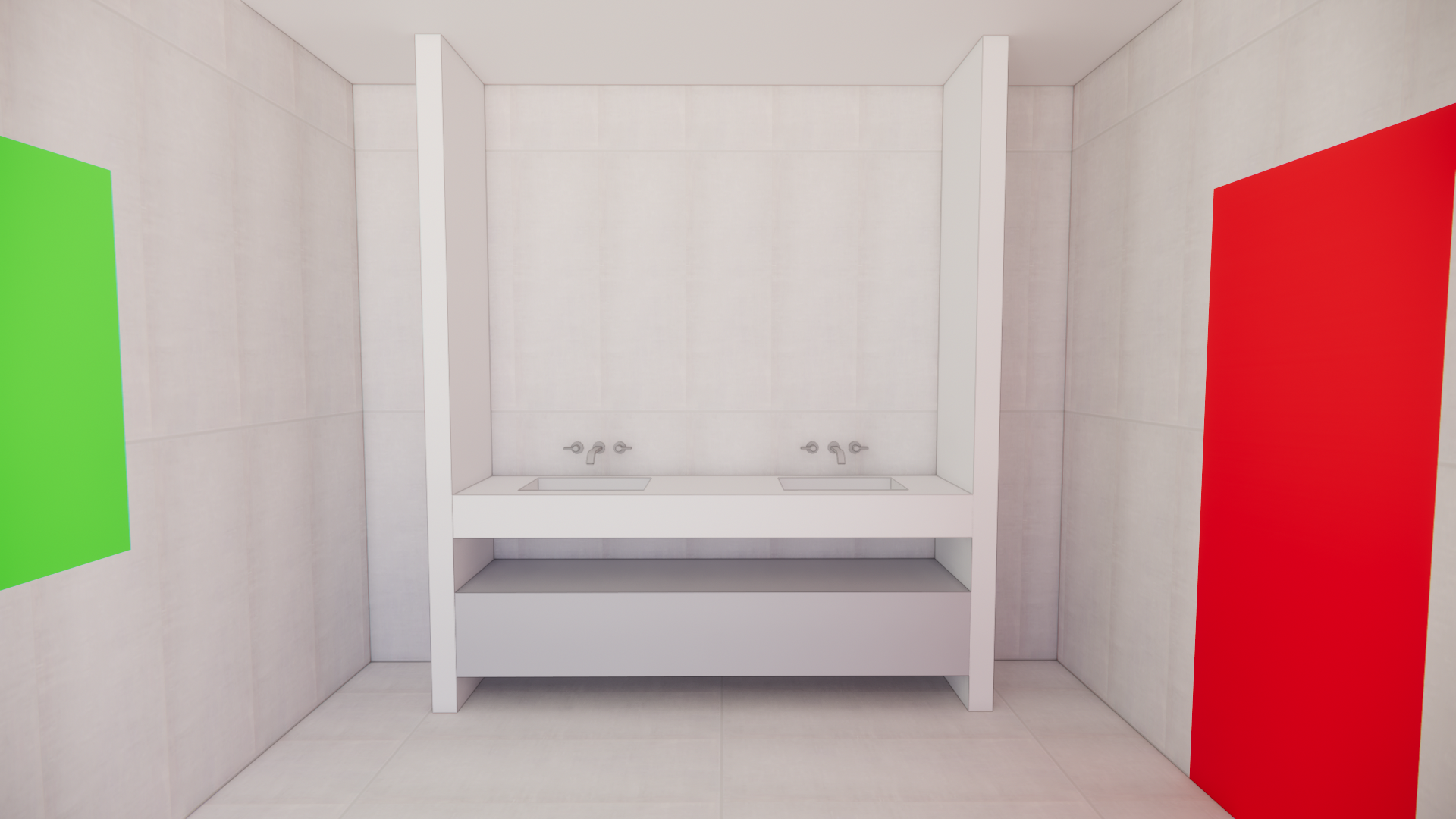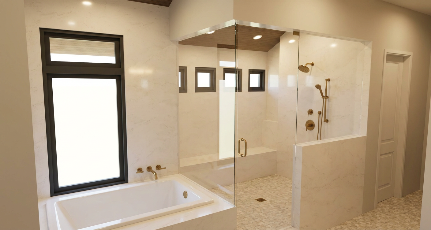 keep everything exactly the same in the rendering do not change the layout walls doors windows shower niche plumbing fixtures wall tile lighting vanity or any materials only change the size and scale of the floor tile the floor tile should be the same exact material and color but the tile size should be changed to large format rectangular tiles approximately 16 x 32 reduce the number of grout lines so the tiles appear larger keep the tile layout straight do not change the tile material color layout direction or anything else only change the the tile on the floor and walls to look more realistic and we be a warmer white with a vertical grain do not change the scale of the tiles shape or size keep everything else exactly the same do not add anything else make the final image look like a realistic photo rendering with natural lighting and soft shadows