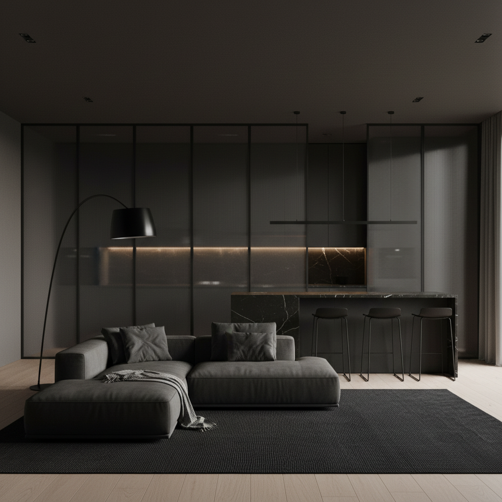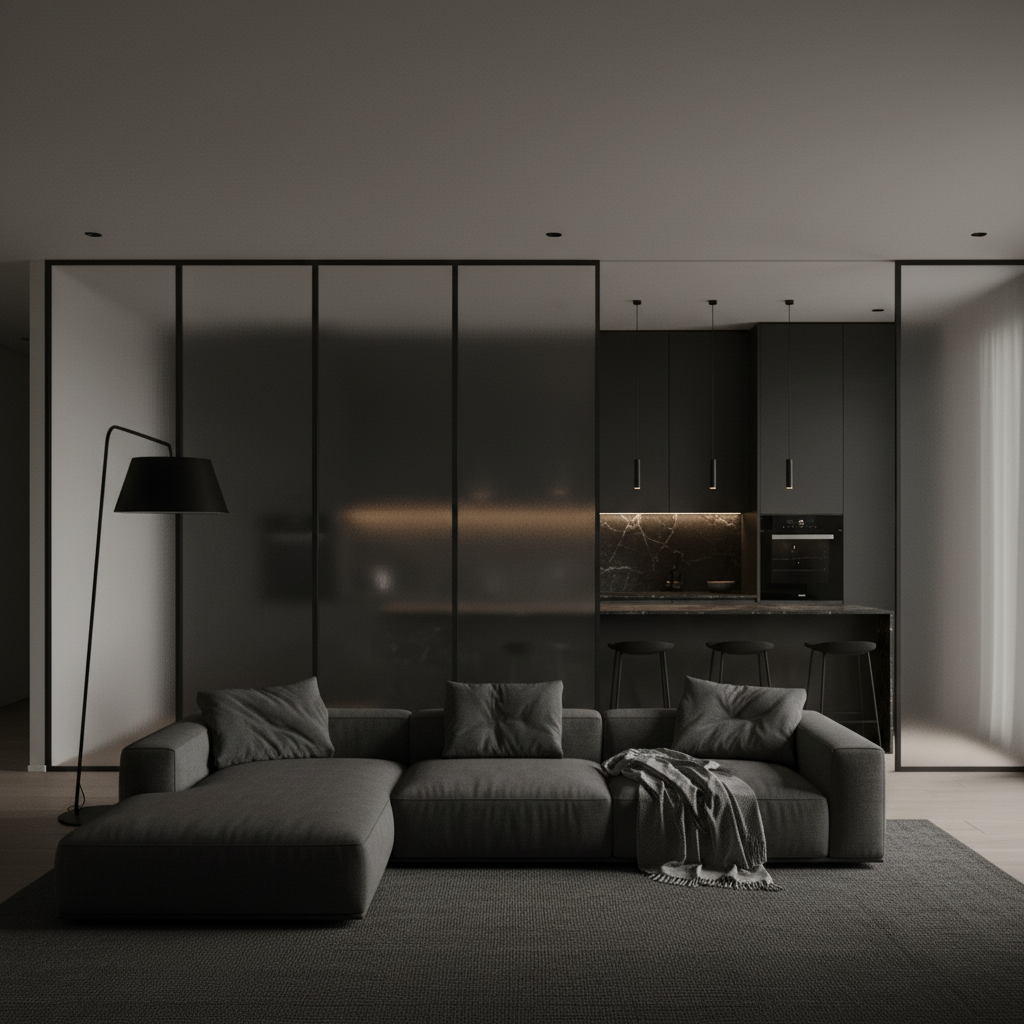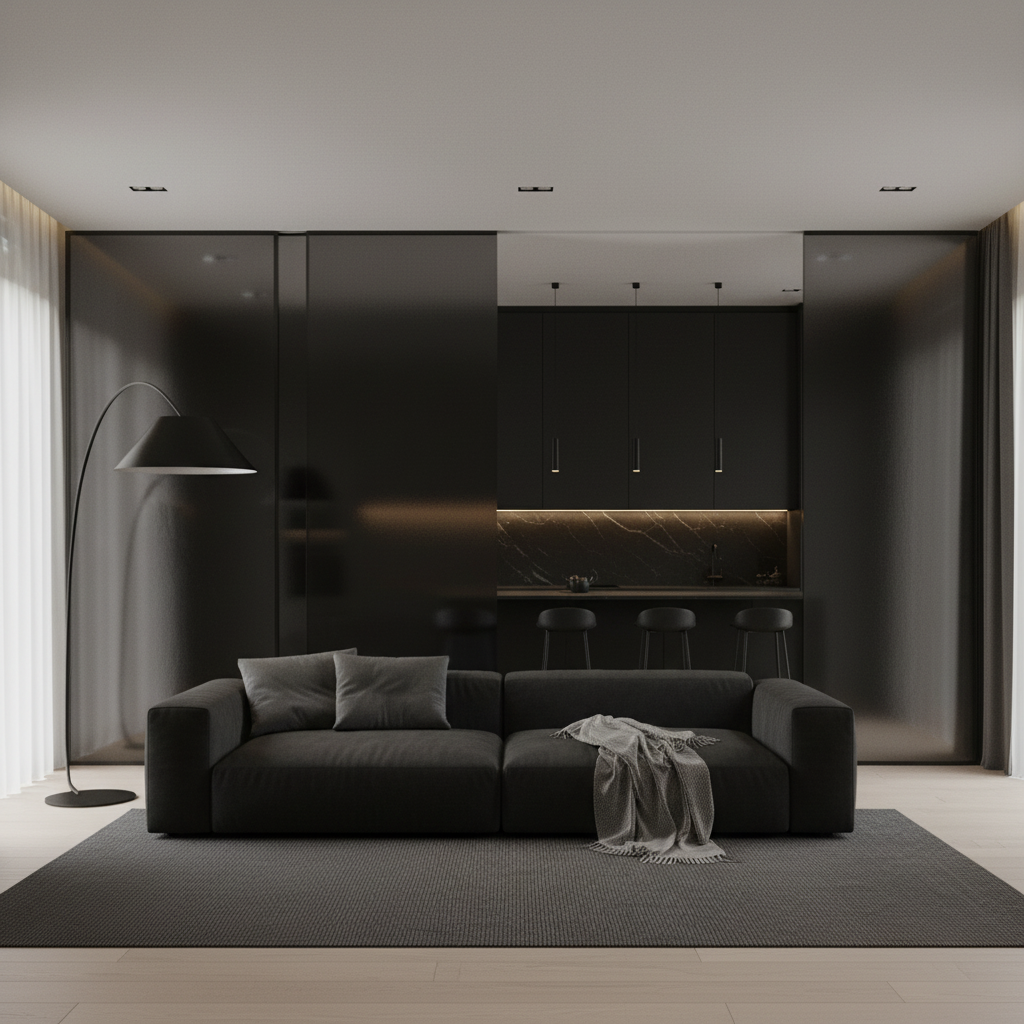 a modern bedroom interior the atmosphere is cozy and sophisticated the bed has a soft light gray headboard with an elegant pattern the bedding is a soft white with subtle orange geometric patterns the wall behind the bed is adorned with abstract circular art in warm gold tones and delicate orange outlines the side tables are a rich dark brown wood accented with a sleek pink neon trim the sofa on the left is plush and white adding a touch of luxury the walls are a textured beige complementing the light wood flooring the doors are a refined beige with light blue accents soft ambient lighting creates warmth and a welcoming atmosphere