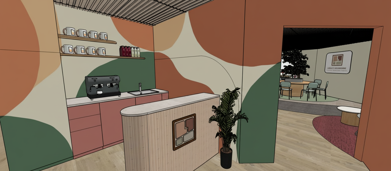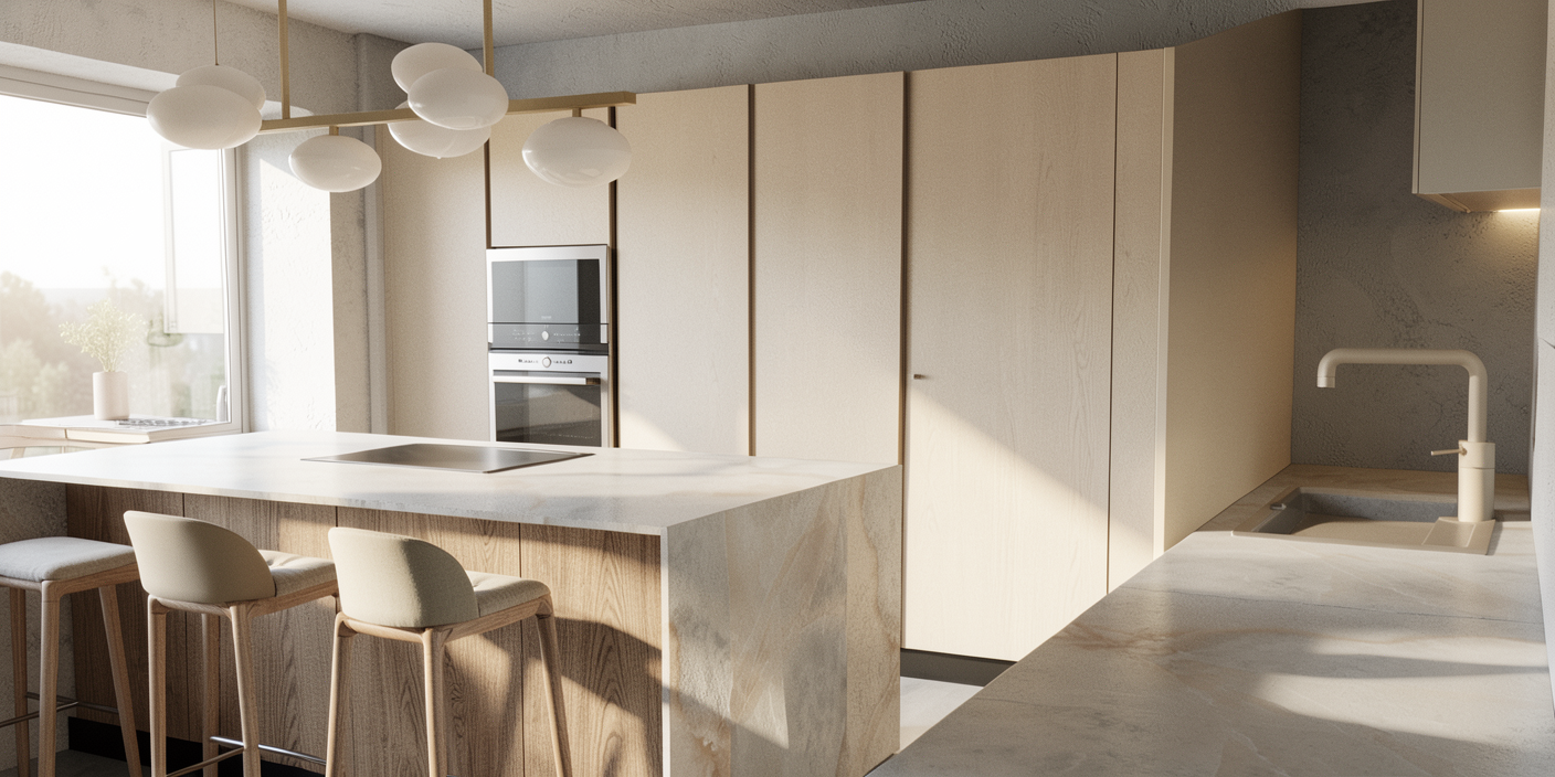 keep exact same design layout and camera do not change anything change only the bed headboard material make it upholstered fabric in the same color tone as the reference image soft warm beige cream smooth clean surface no stitching no vertical or horizontal lines no panels no patterns fully minimal fabric finish keep everything else unchanged