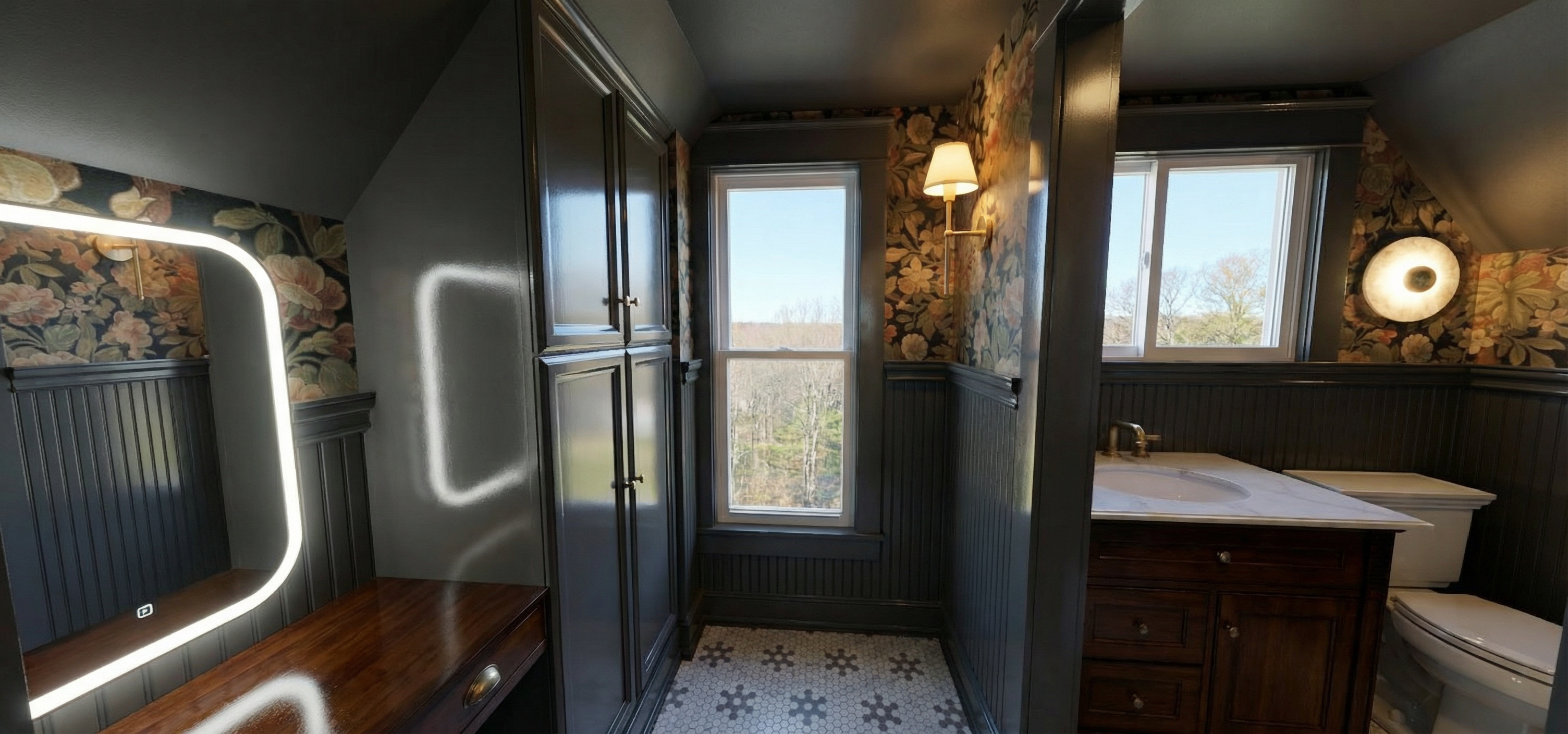 maintain all geometry create a hyper realistic interior rendering this is a second floor room facing south so the view out of the window should reflect that and show trees in the distance the painted casework should be a semi gloss finish the wood casework should remain as wood with a gloss finish the sconces should be lit in a 2700k temperature and a soft glow the ceiling should be a matt paint finish the item above the toilet is a sconce that should show as lit in the center but diffused from view and there is a circular marble plate on the back that should glow show the mirror on the left side brightly lit around the edges