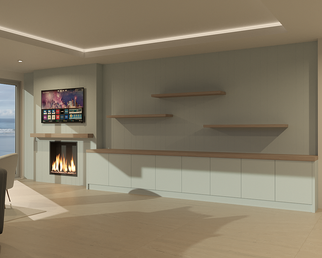create a minimalist modern living room with a coastal view the walls are painted light beige creating a warm neutral backdrop add a sleek tv on the left side displaying vibrant colors design a subtle cozy fireplace below the tv with flames in shades of orange and yellow incorporate three floating wooden shelves in a light oak finish evenly spaced on a pale gray background the flooring is light wood complementing the neutral tones the atmosphere is calm and inviting set in the gentle glow of soft recessed lighting include a large window on the left side showcasing a serene ocean view under a clear blue sky