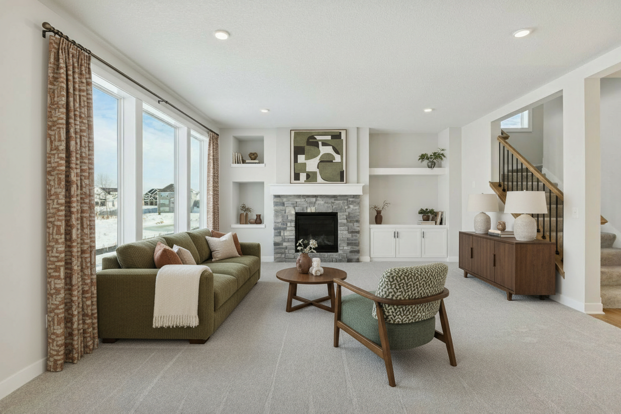 do not change the sizing or photo proportions of the room stage the home like a model with a king size bed a nightstand on each side of the bed with matching lamps and place a dresser on the far wall with a mirror over it no other furniture make it feel like a pottery barn vibe