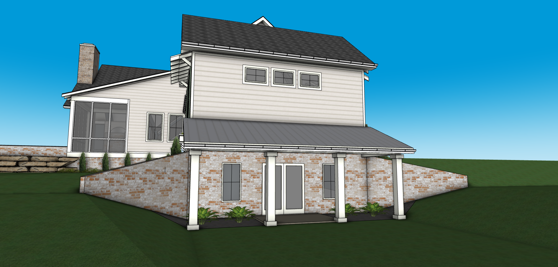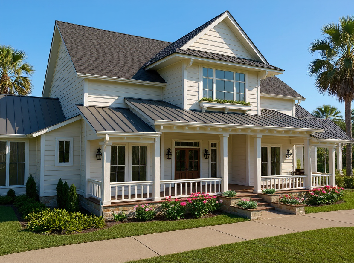 a modern suburban house scene featuring a detailed and elegant white facade with white accents and a slate gray roof the house has prominent columns supporting a porch crafted with white pillars the environment includes a lush green lawn and a well maintained driveway in the foreground hostas add a touch of greenery alongside rich green bushes the sky is a clear bright blue creating a serene and inviting atmosphere radiating warmth and tranquility