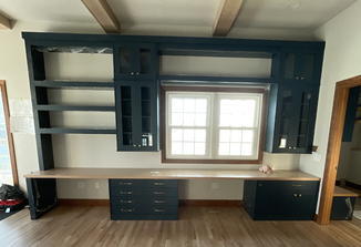 do not change the cabinets in any way preserve the exact cabinet colors materials finishes dimensions door and drawer styles hardware spacing alignment and all geometry exactly as shown do not alter the countertop shape backsplash appliances flooring lighting fixtures or wall structure only remove the construction materials clutter and mess from the scene clean the room and make it look finished and staged add a few simple tasteful home accessories appropriate for the style of the space but do not add or remove any furniture windows or architectural elements maintain the original lighting direction and realism enhance clarity and polish the photo while keeping the cabinetry and room design completely unchanged do not alter the lighting to keep the cabinet colors as they are in the image add new flooring put desk chairs in the openings stage the shelves and countertop for a modern minimalistic office put a view out the window