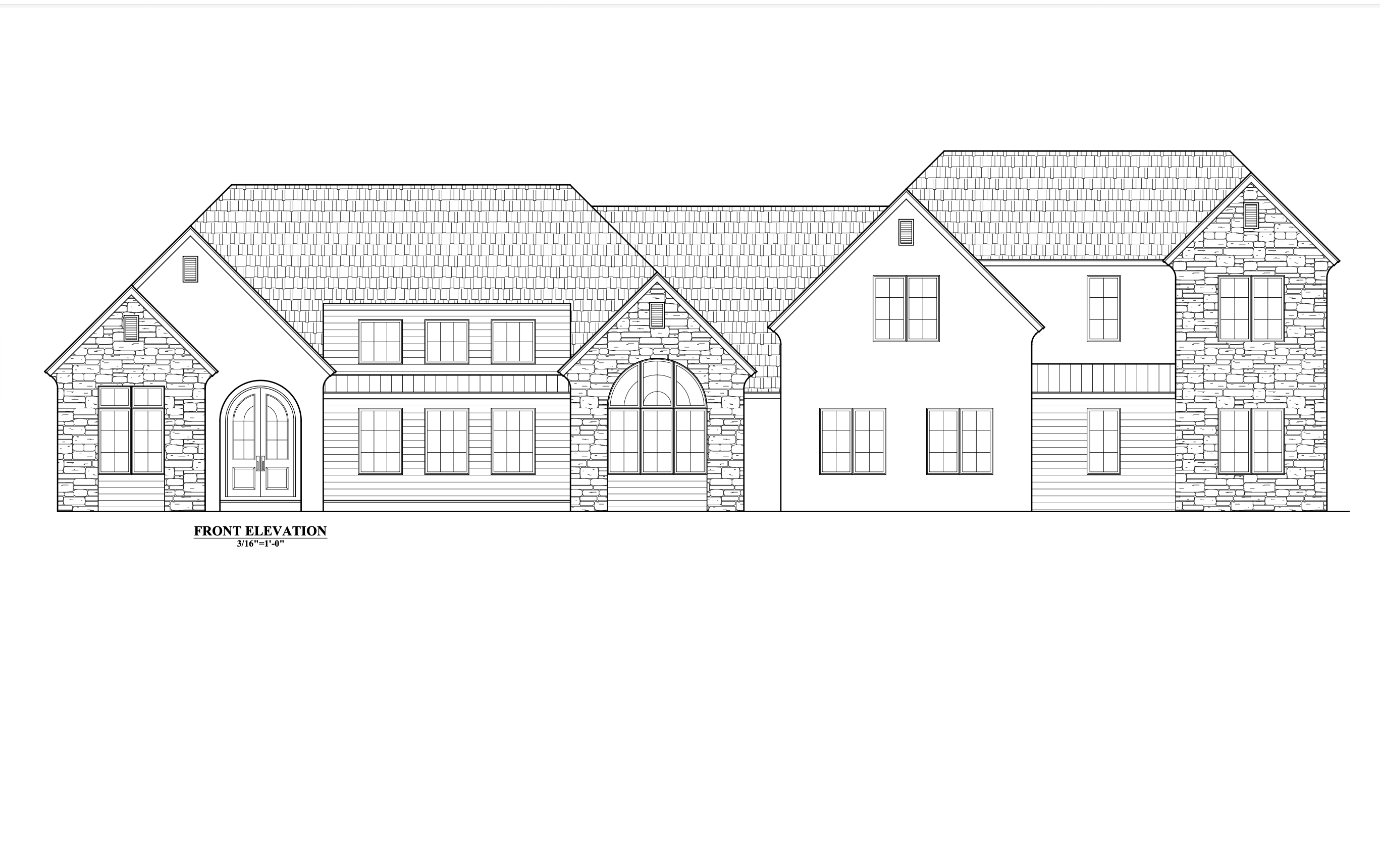 follow the front elevation sketch exactly the design should feature a light natural stone veneer and white board and batten complemented by a black architectural shingle roof and black standing seam metal roof accents over smaller roof sections and dormers use daytime natural lighting with a clear blue sky render the home in neutral realistic tones with accurate proportions shadows and depth include subtle landscaping neatly trimmed green lawn low shrubs and a light concrete walkway but keep focus on the house itself